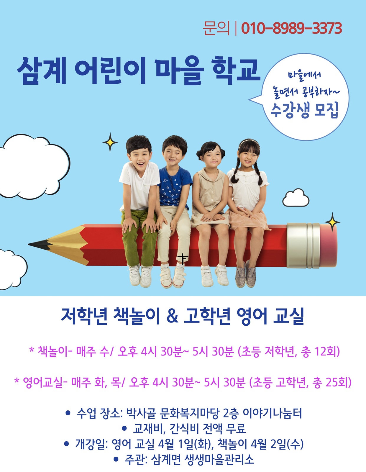 ‘삼계면 생생마을관리소’에서‘모아 모아 즐거운 마을학교’라는 이름으로, 고학년 학생을 대상으로 매주 2회(화, 목) 영어 교실을 운영하고, 유아와 저학년을 대상으로 매주 수요일 책 놀이 교실을 진행하고 있다.