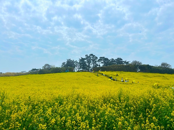 탁 트인 들녘을 배경으로 펼쳐진 수성당 유채꽃밭은 바다, 하늘, 산과 어우러져 환상적인 황홀경을 선사해 감탄을 자아내고 있다.
