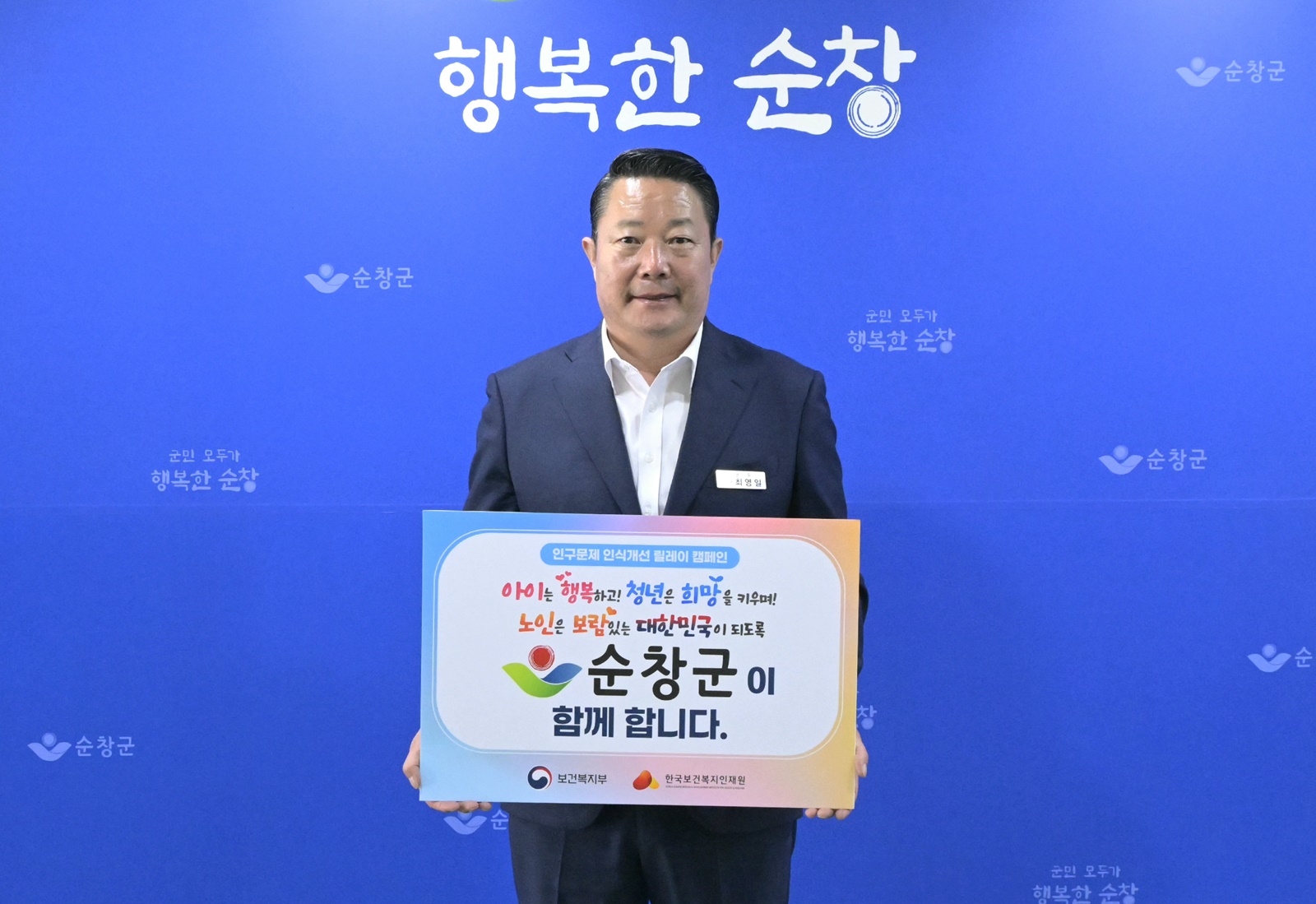 이번 캠페인은 보건복지부와 한국보건복지부인재원 주관, 인구감소와 고령화 문제에 대한 사회적 인식을 높이고 사회적 관심을 환기하기 위한 활동이다. 최영일 순창군수는 심민 임실군수의 지목을 받아 캠페인에 참여했다.