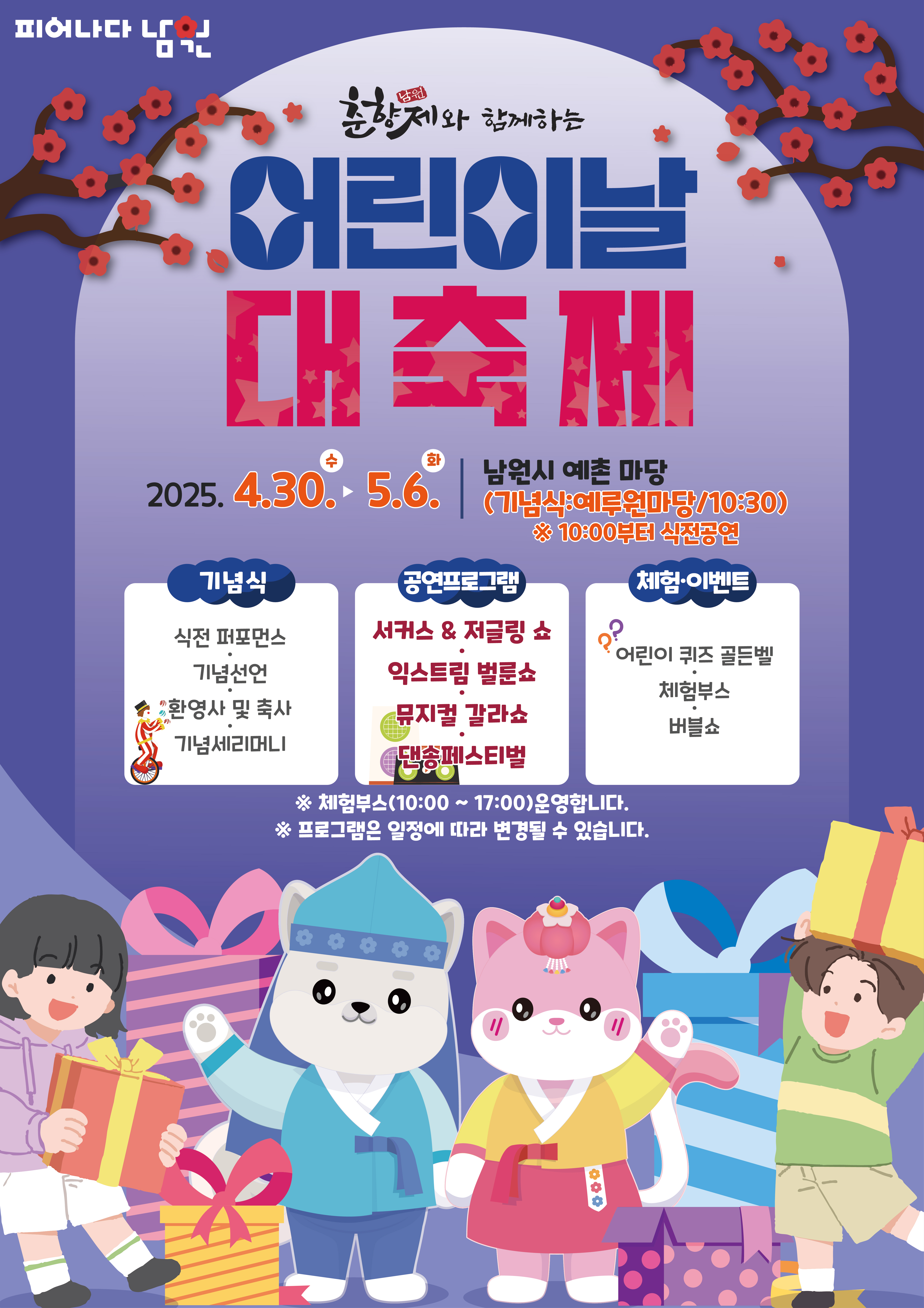 행사는 남원예촌 마당에서 열리며 ▲서커스&저글링 공연 ▲어린이집 재능공연 ▲청소년 어울림 마당 ▲익스트림 벌룬쇼 ▲어린이 뮤지컬 갈라쇼 등의 다양한 공연 콘텐츠가 마련되어 어린이들에게 즐거움을 선사할 예정이다. 이와 함께, 가족 단위 관람객이 참여할 수 있는 놀이체험 부스를 운영하여 축제의 풍성함을 더할 것으로 보인다.
