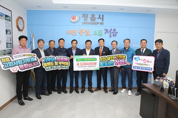 전주개인택시 정읍향우회는 전주 지역에서 활동하는 정읍 출신 개인택시 운수종사자 100여 명으로 구성돼 있다. 이들은 고향사랑기부 외에도 매년 정읍시민장학재단에 장학금을 기탁하는 등 지역 인재 육성과 고향 발전에 꾸준히 기여하고 있다.