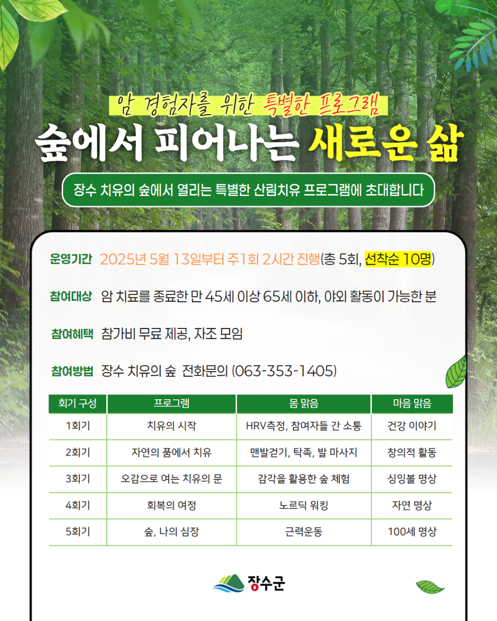 배종수 산림과장은 “이번 프로그램이 암 경험자들에게 몸과 마음을 치유할 수 있는 뜻깊은 시간이 되길 바란다”며 “앞으로도 산림자원을 활용한 다양한 치유 프로그램을 지속적으로 운영해 나가겠다”고 말했다.