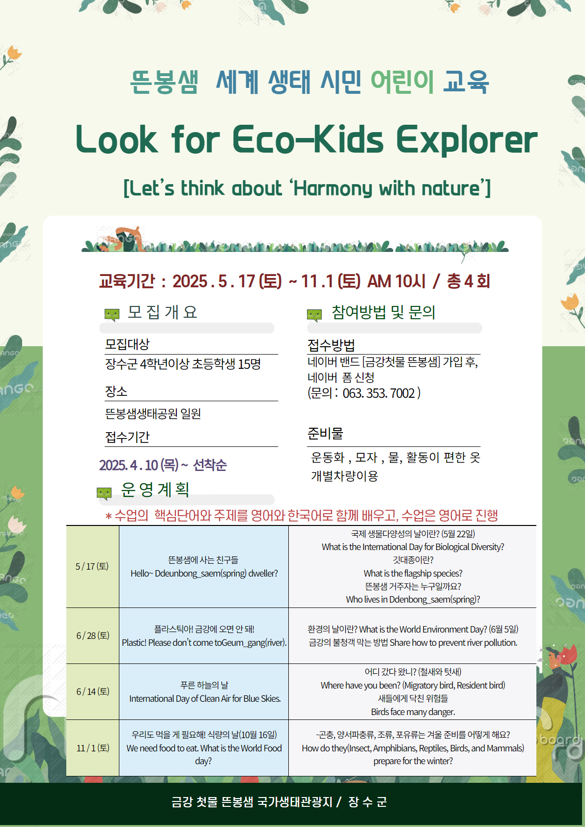 참가 대상은 장수군 내 4학년 이상 초등학생이며 15명을 선착순으로 모집한다. 교육은 ‘금강첫물 뜬봉샘 국가생태관광지’에서 무료로 운영되고 참가 학생들은 활동에 적합한 복장과 간단한 준비물만 챙기면 된다.
