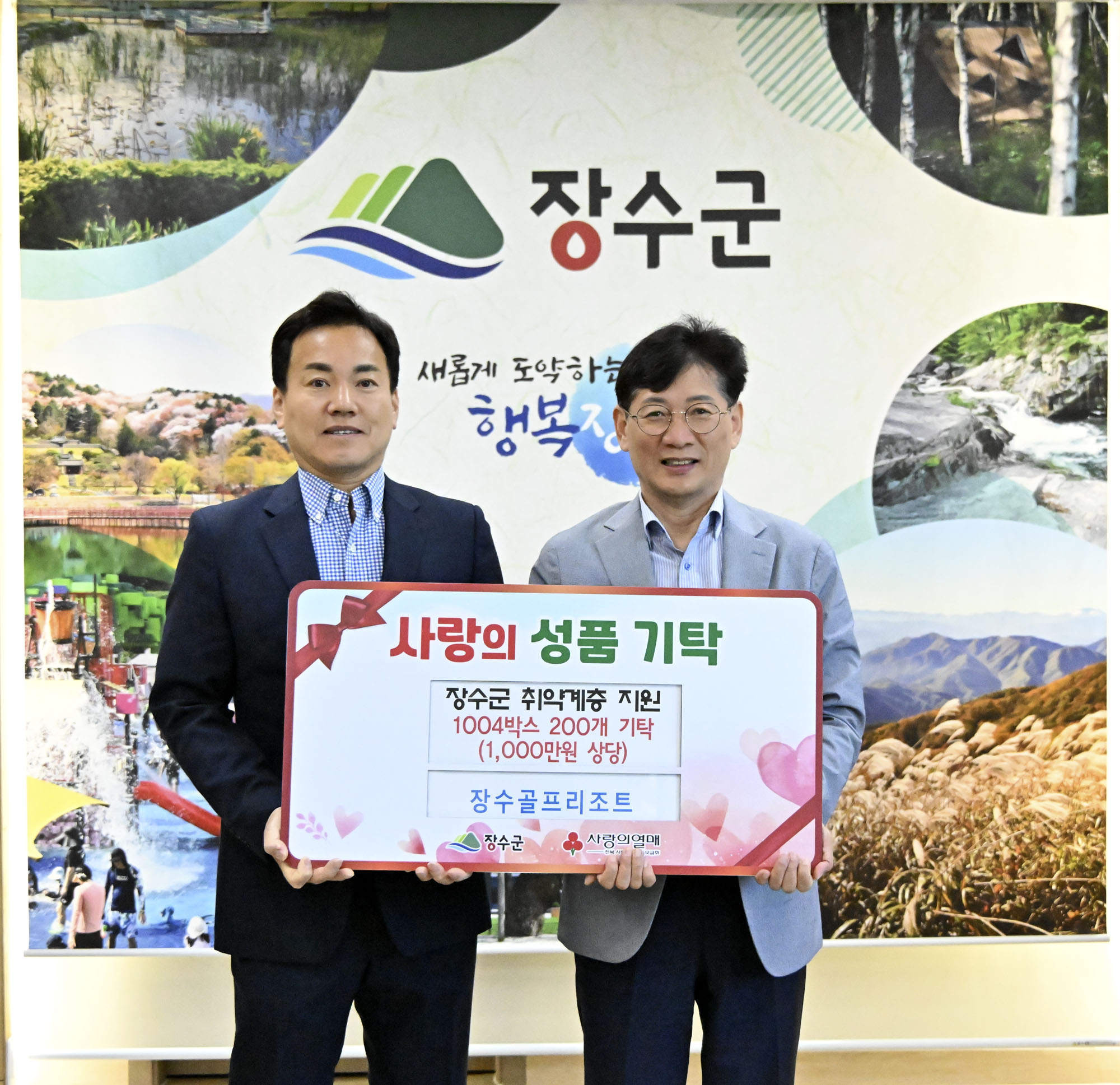 [장수=뉴전북]장수골프리조트(대표 이용규)는 8일 장수군 취약계층을 위해 ‘1004박스(생필품 꾸러미)’ 200개(1,000만원 상당)를 기탁했다.