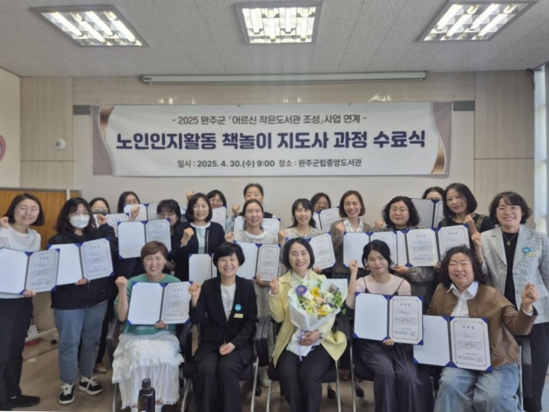 [완주=뉴전북] 완주군이 8일 ‘2025 어르신 작은도서관 조성사업’으로 진행된노인인지활동 책놀이지도사 2급 양성과정 수료식을 가졌다고 밝혔다.