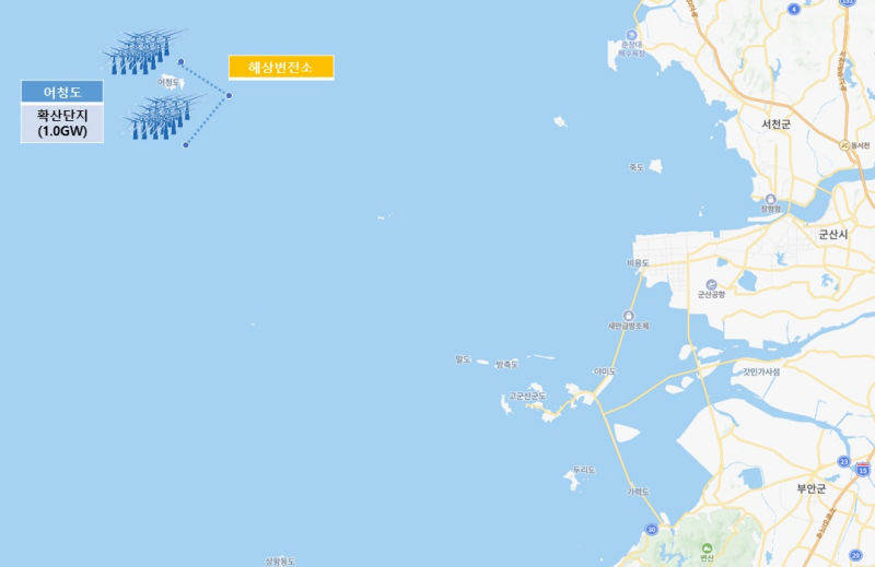 군산시 해상풍력 집적화단지는 약 1GW급 발전 용량이 목표이며 사업구역은 군산시 어청도 인근 해역(약 180㎢)이다.