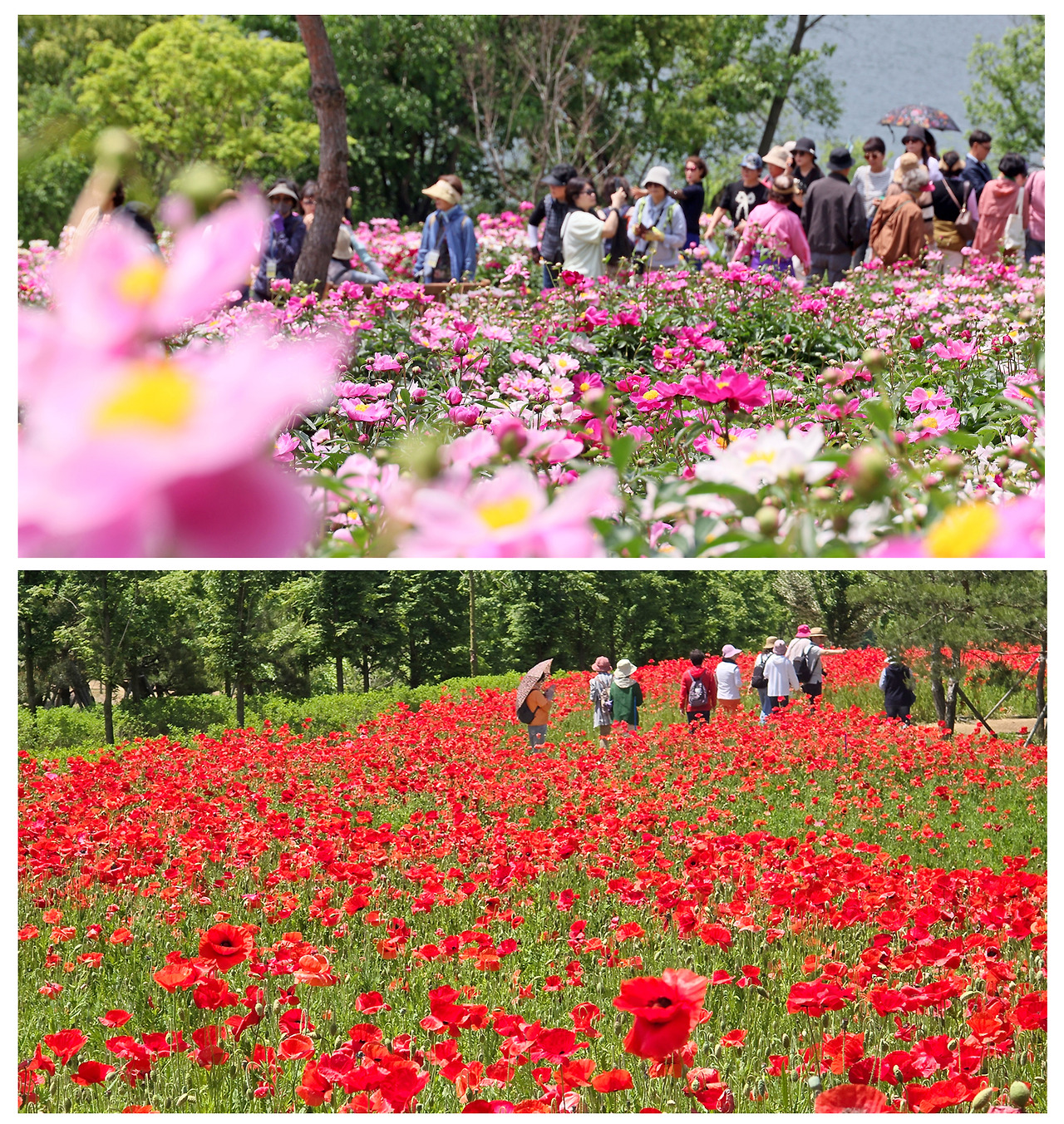 [임실=뉴전북] 전북 임실군 옥정호 붕어섬 생태공원과 운암면 운종리 일대가 5월을 맞아 화려한 작약과 붉은 꽃양귀비로 뒤덮이며 아름다운 장관을 선사, 전국 각지에서 찾아온 관광객들에게 큰 인기를 끌고 있다.