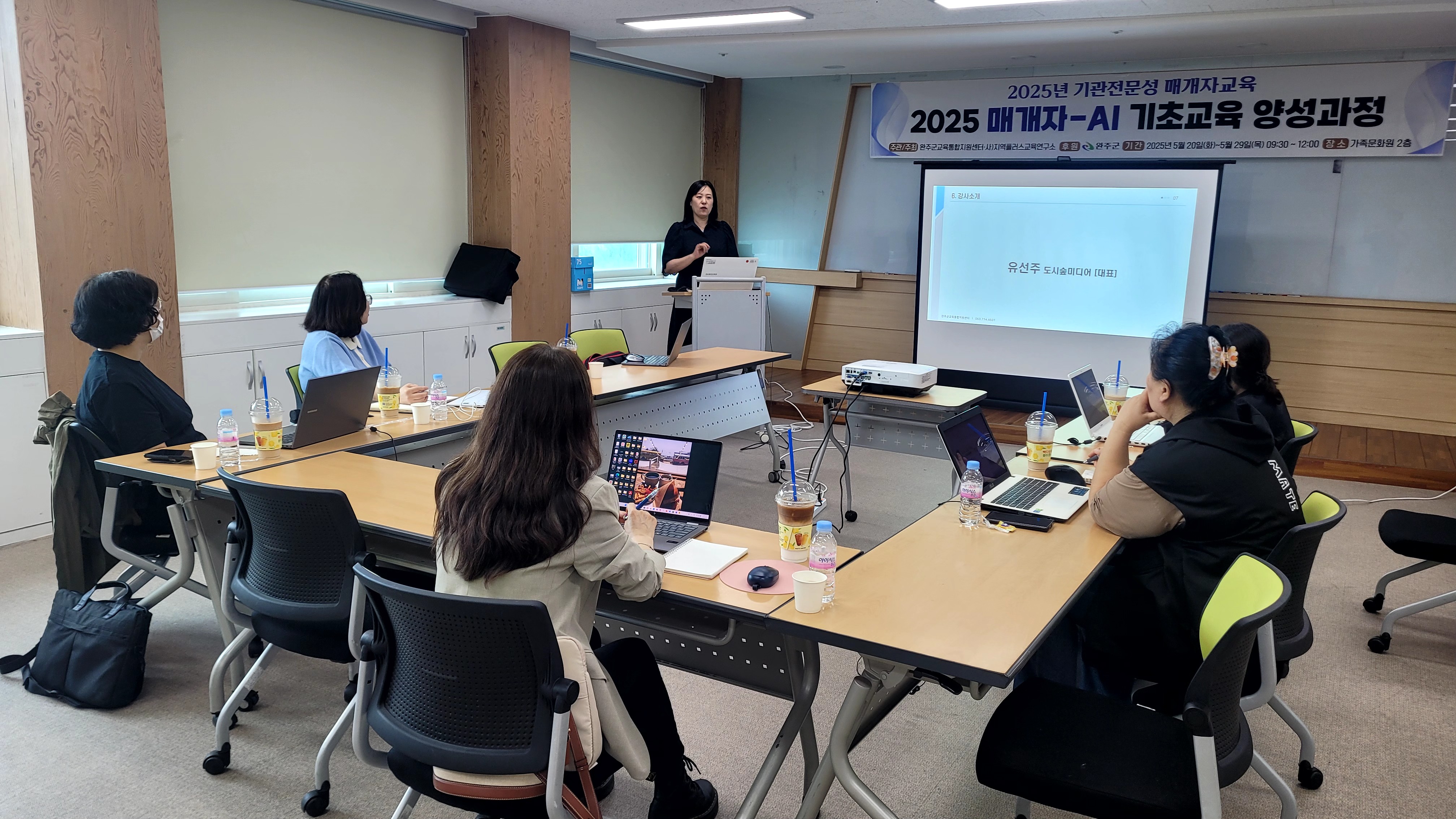 첫날 교육에서는 오리엔테이션(OT)과 함께 AI 프로그램(PPT, 영상, 챗GPT 등)을 소개하는 시간이 마련되었으며, 참여자들은 다양한 AI 도구와 프로그램에 대해 배울 수 있었다. 이후 교육은 소그룹 활동을 중심으로 진행되며, 참여자들이 서로의 아이디어를 나누고 협력하는 과정을 통해 실천적 역량을 키워 나가고 있다.