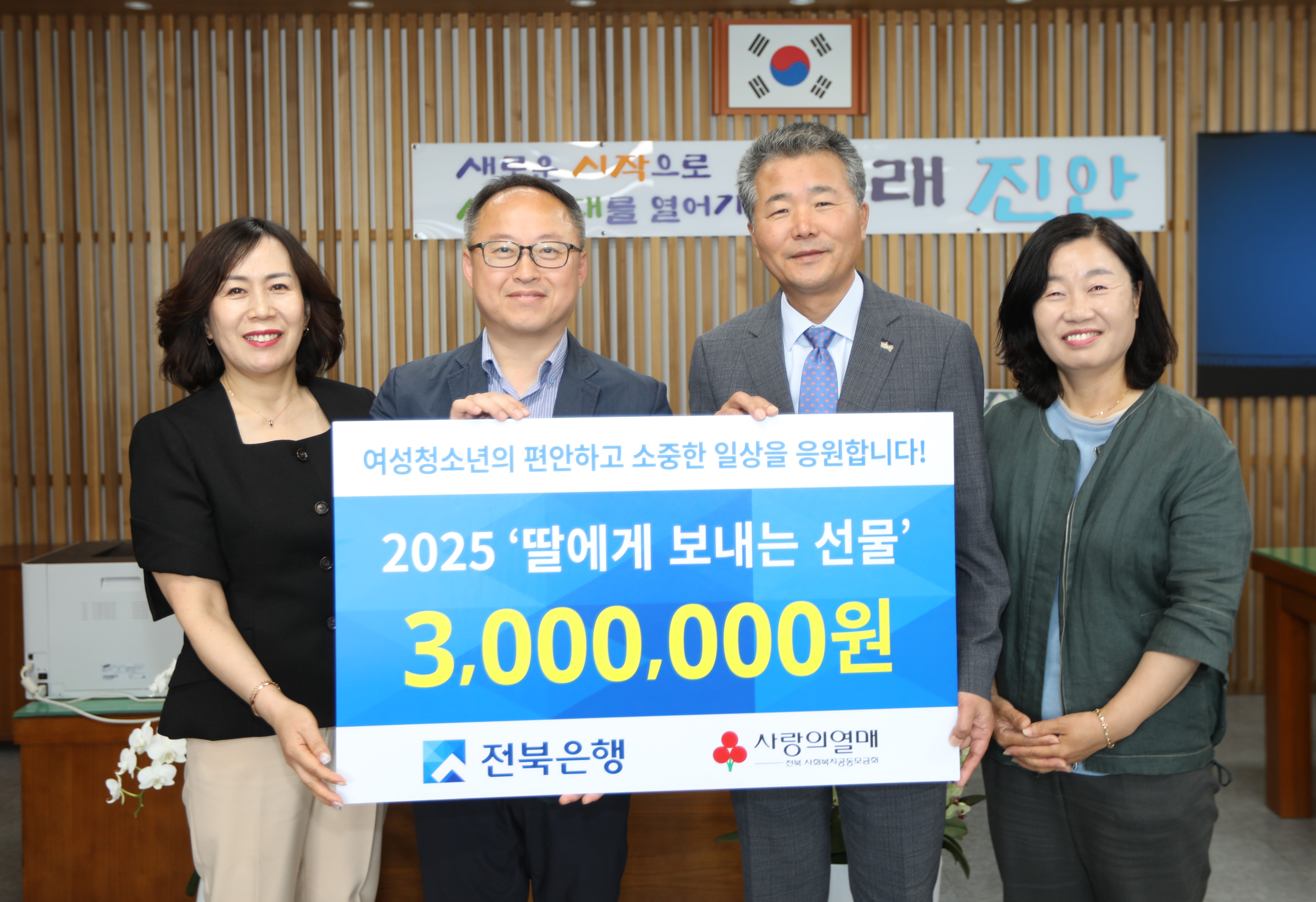 강태호 전북은행 진안지점장은 “딸에게 보내는 선물이 진안군의 여성청소년들에게 작은 기쁨과 위로가 되길 바란다”며, “앞으로도 지역사회와 함께하는 다양한 나눔활동을 지속적으로 펼쳐 나가겠다”고 밝혔다.