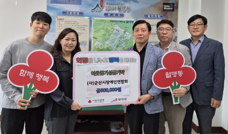 [군산=뉴전북] 군산시 월명동 행정복지센터(동장 김영효)는 26일 (사)군산시장애인연합회(회장 박경래)로부터 이웃돕기 성금 50만 원을 기탁받았다고 밝혔다.