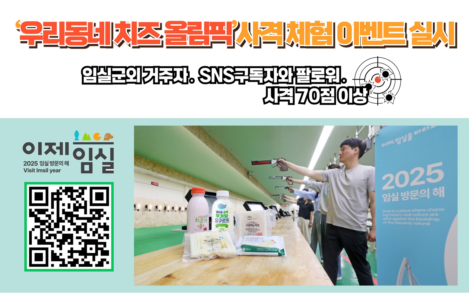 - 임실관광도 즐기고, 사격도 쏘고, 치즈도 받고 1석 3조 특별이벤트, 11월 말까지,관외 거주자․SNS 구독자와 팔로워․사격 70점 이상, 추첨 통해 치즈 세트