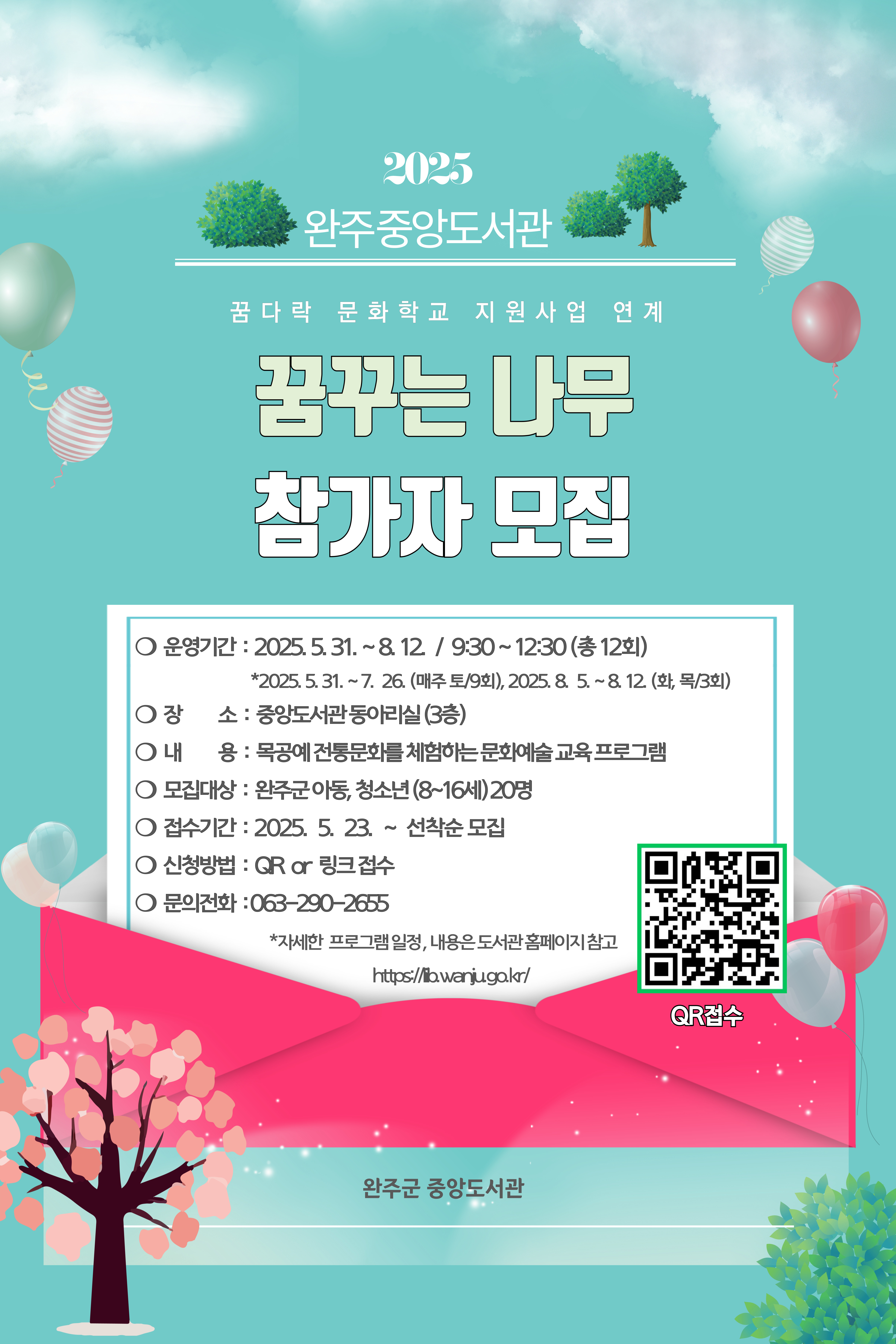 자세한 사항 및 참여 신청은 완주군 중앙도서관 홈페이지 (https://lib.wanju.go.kr) 독서문화행사 안내를 참고해 링크 또는 QR 접수 가능하다. 문의전화는 290-2655으로 하면 된다.