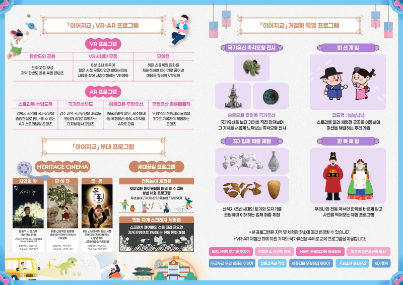 참여기관은 교육 프로그램뿐만 아니라 AR(증강현실), VR(가상현실) 등을 활용한 디지털 콘텐츠 체험을 통해 학생들과 지역주민들이 다양한 국가유산을 경험할 수 있다.