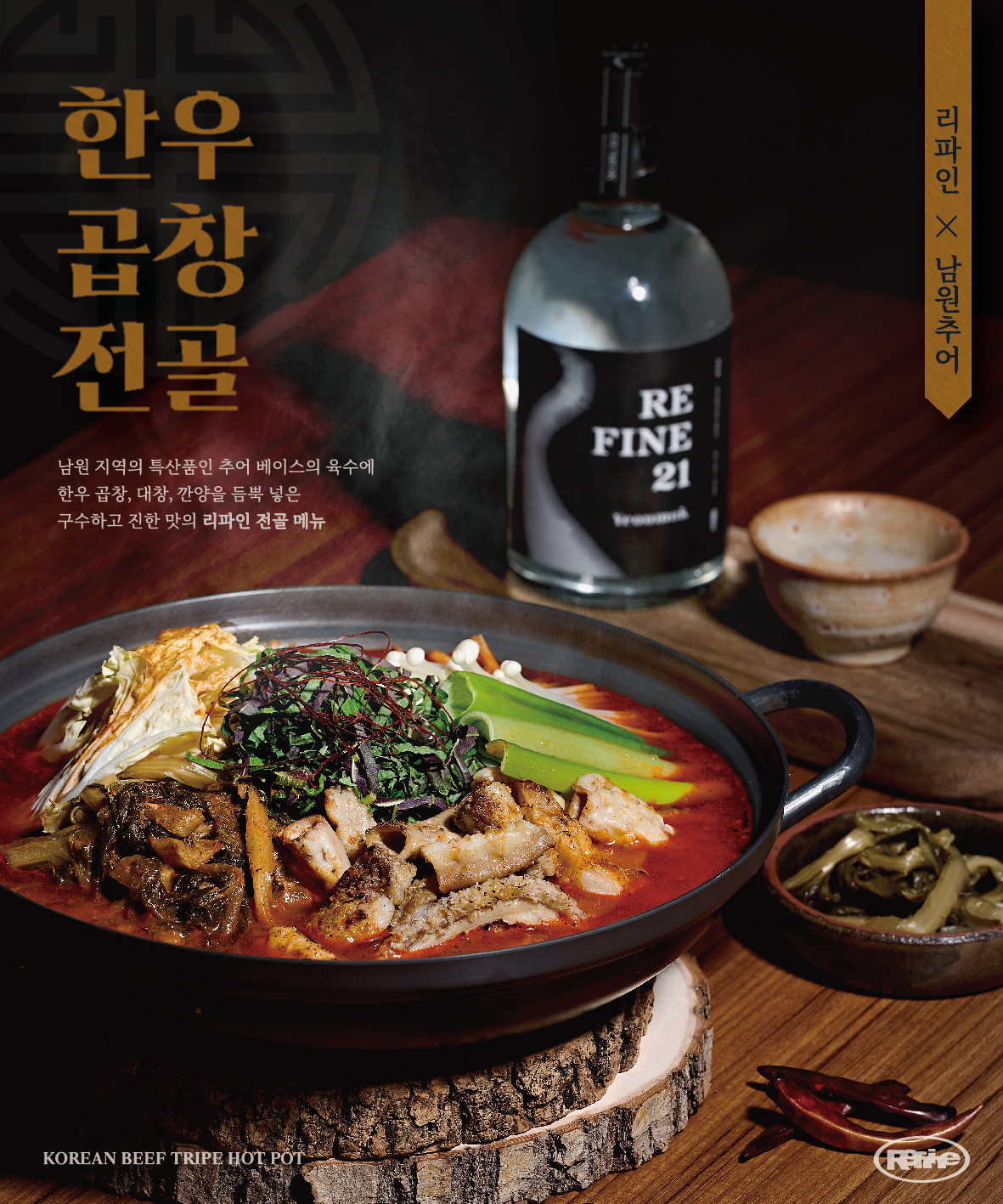 ‘남원추어 한우곱창전골’은 남원산 추어페이스트로 우려낸 진한 육수에 국산 한우곱창, 특제 양념과 신선한 채소가 어우러져 깊고 중독성 있는 맛을 자랑한다. 리파인의 전통주와 어우러지는 완성도 높은 페어링 메뉴로서, K-푸드의 미식 가치를 한층 끌어올렸다.