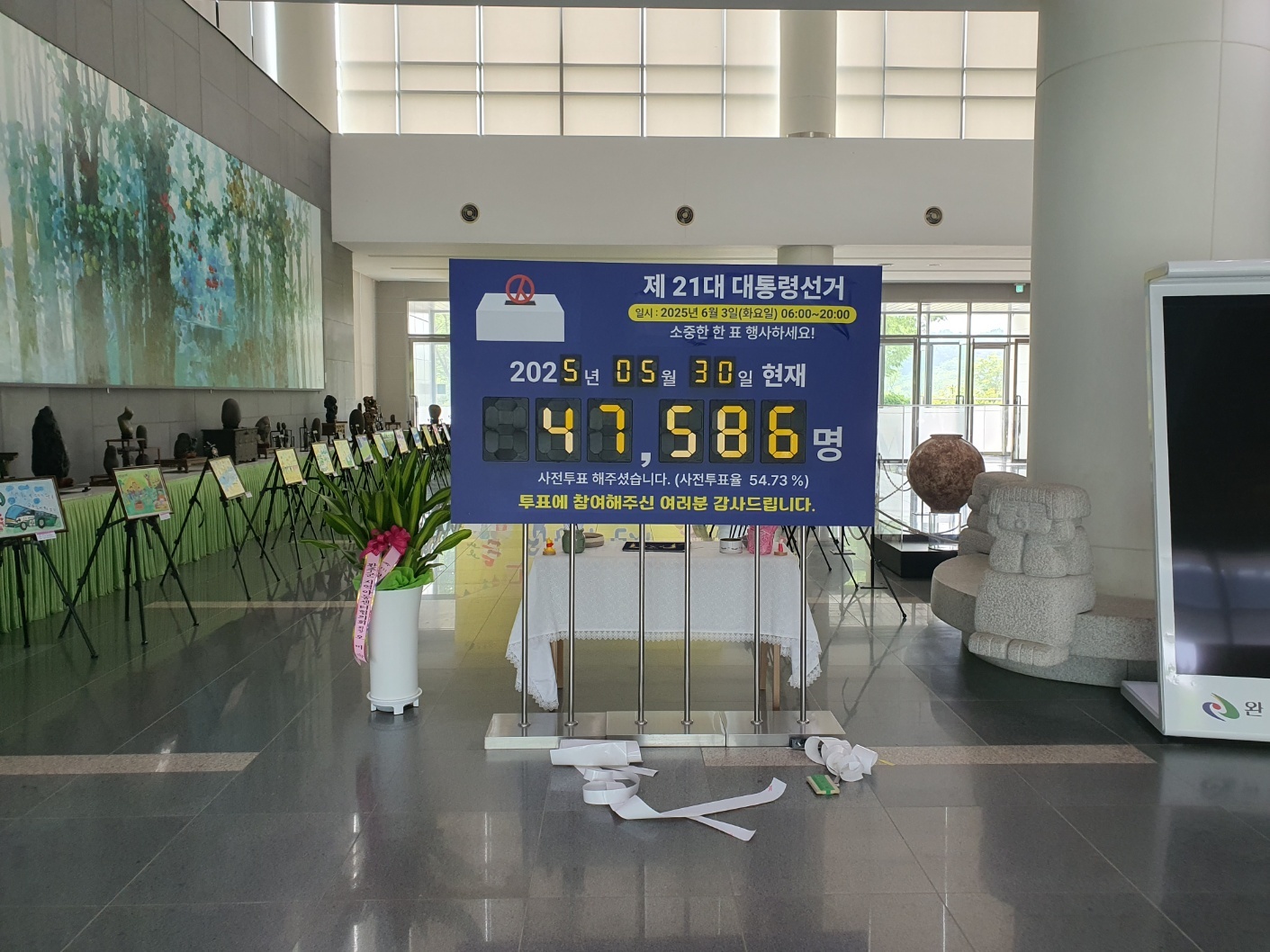 현황판은 ‘소중한 한 표 행사하세요!’라는 문구와 함께 6월 3일 본투표일과 투표시간(06:00~20:00)을 안내하고 있어, 아직 투표를 하지 못한 유권자들의 참여를 적극 독려하고 있다.