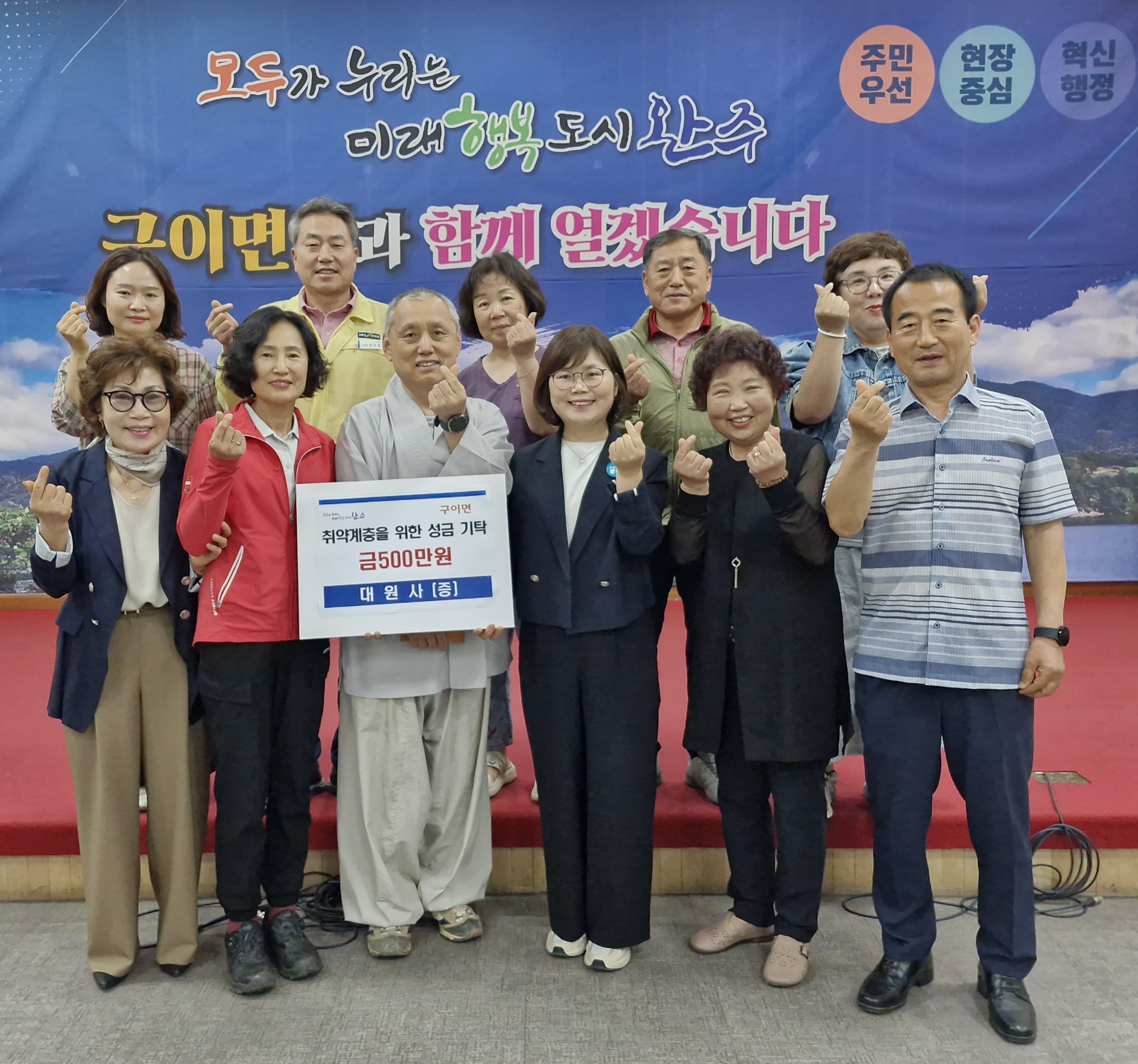 이번 성금은 주지 스님과 신도들이 지역의 어려운 이웃들과 따뜻한 마음을 나누기 위해 마련된 것으로, 구이면 지역사회보장협의체 복지사업을 통하여 취약계층 가구에 사용될 예정이다.