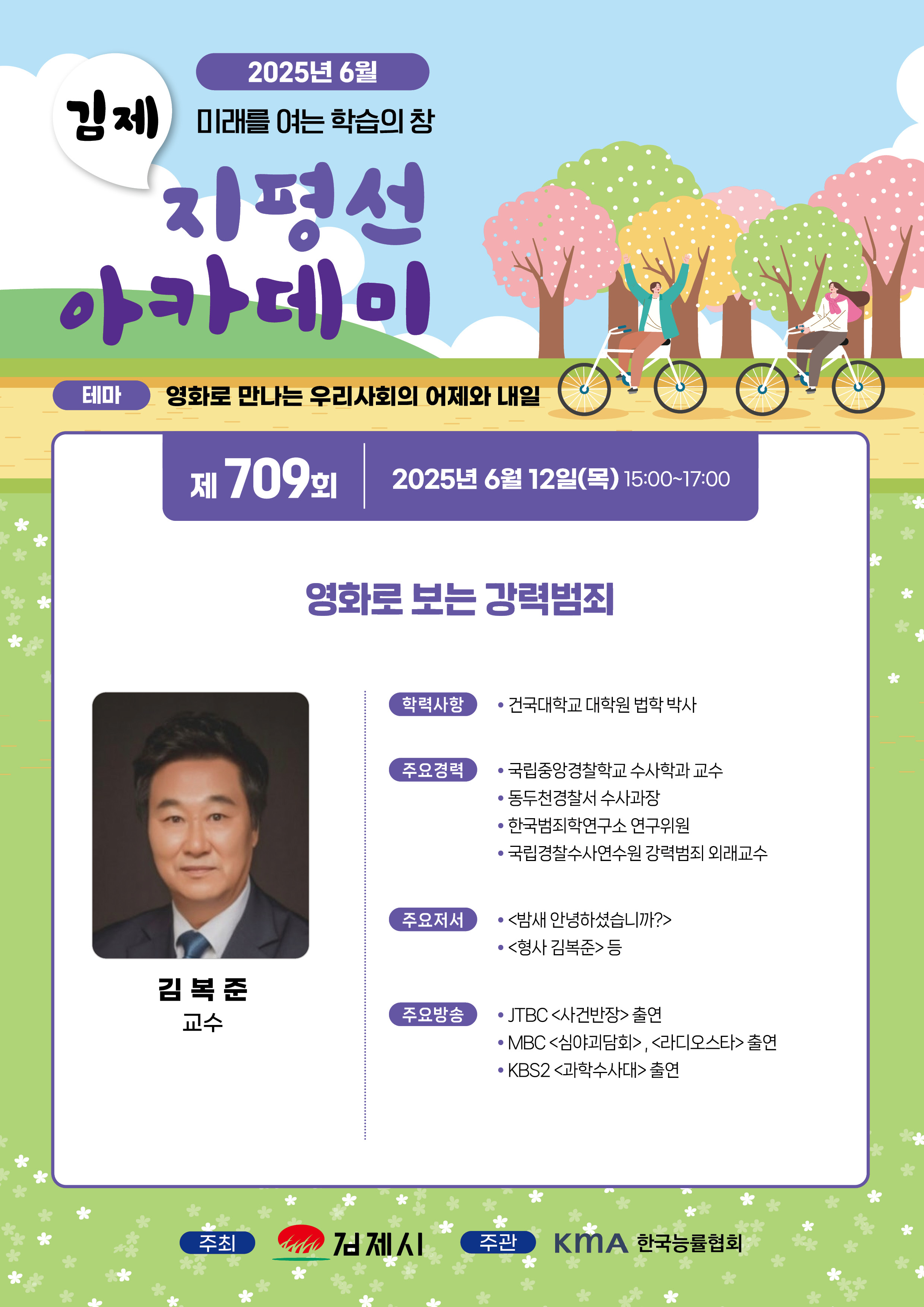 오는 12일 강연에서 김복준 교수는 ‘영화로 보는 강력범죄’라는 주제로 강연에 나선다. 오랜 기간 강력범죄 분석과 수사 자문에 참여해 온 김 교수는 영화 속 범죄 장면을 바탕으로 실제 사건과의 유사점, 그리고 현실에서의 법적‧사회적 맥락을 깊이 있게 짚어줄 예정이다. 범죄에 대한 이해를 높이고, 이를 통해 우리가 살아가는 사회의 어두운 단면을 돌아보는 시간이 될 것으로 기대된다.