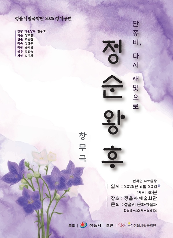 정읍시는 오는 20일 오후 7시 30분, 정읍사예술회관에서 정읍시립국악단의 정기공연 정순왕후 ‘단종비 다시 새빛으로’를 무료로 개최한다. 이번 공연은 조선 제6대 임금 단종의 정비로서, 남편의 비극적인 죽음을 지켜본 뒤에도 평생 절개를 지키며 살아간 정순왕후 송씨의 삶을 조명하는 무대다.