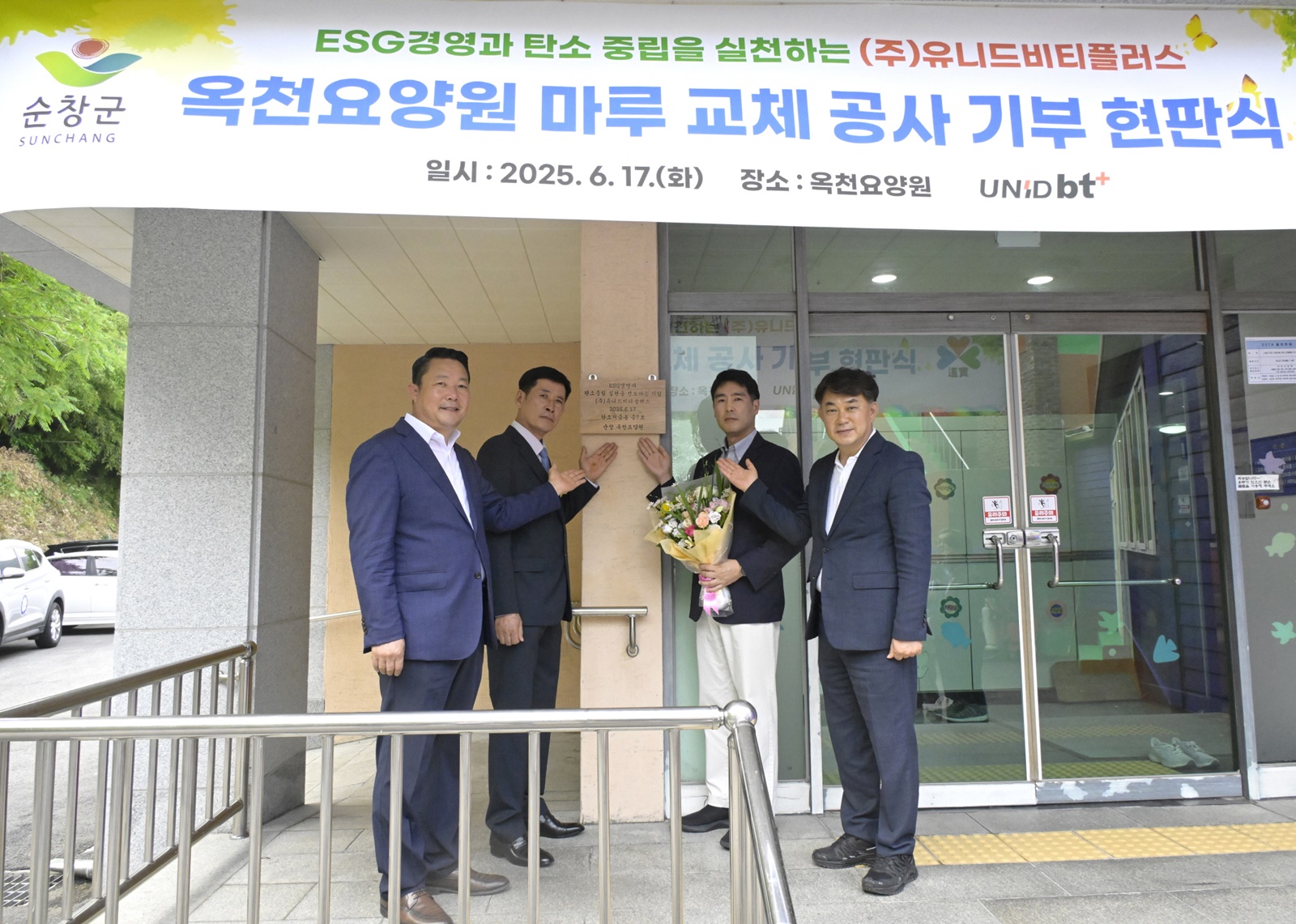 [순창=뉴전북] 옥천요양원(원장 박승순)은 지난 17일 ㈜유니드비 티플러스(대표이사 한상준)의 후원으로 진행된 노후 마루 무상 교체 작업의 완료를 기념하며 현판식을 개최했다.