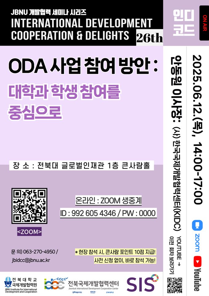 [교육=뉴전북] 전북대학교 국제개발협력원(원장 문경연 교수)과 국제학부, 전북국제개발협력센터(센터장 백숙희)가 공동 운영하는 국제개발협력 전문가 릴레이 세미나 인디코드(INDECODE)’가 국내 최초의 시도로 주목받으며, 국제개발 분야의 대표 세미나로 자리매김하고 있다.