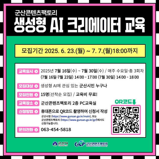 참여 신청은 오는 23일에서 7월 7일까지 군산시청 또는 군산콘텐츠팩토리누리집을 통해 QR 부호(코드)로 접수할 수 있다. 교육 참가 인원은 15명으로 선착순 모집 예정이다.