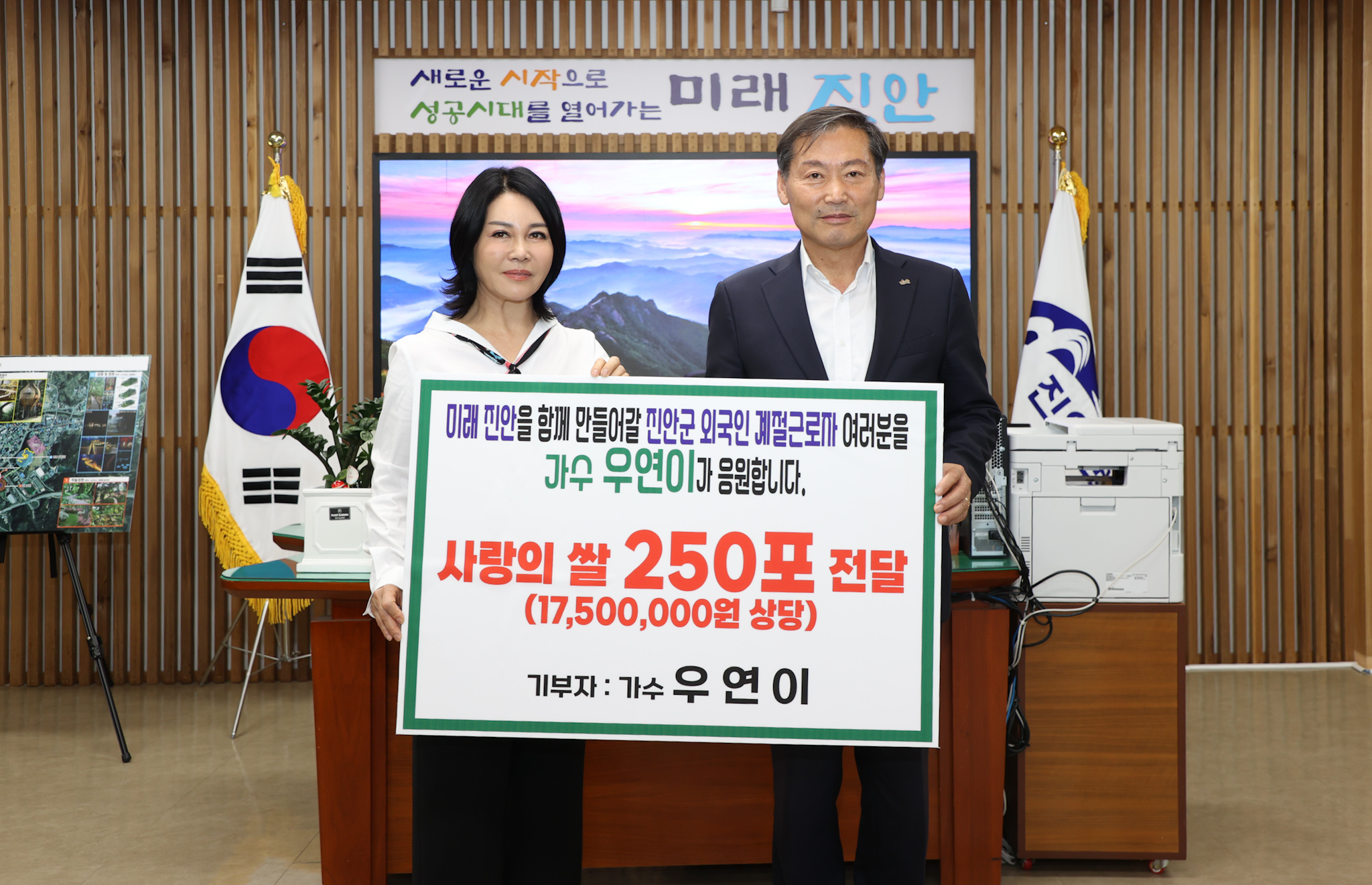 [진안=뉴전북]진안군은 26일 군청에서 가수 우연이 씨가 진안군 외국인 계절근로자(E-8)에게 쌀 250포대를 기부했다고 밝혔다.