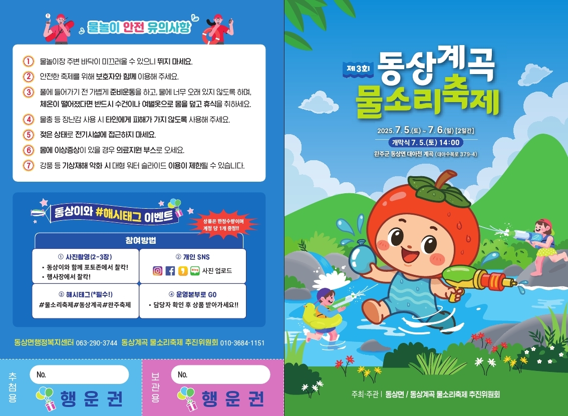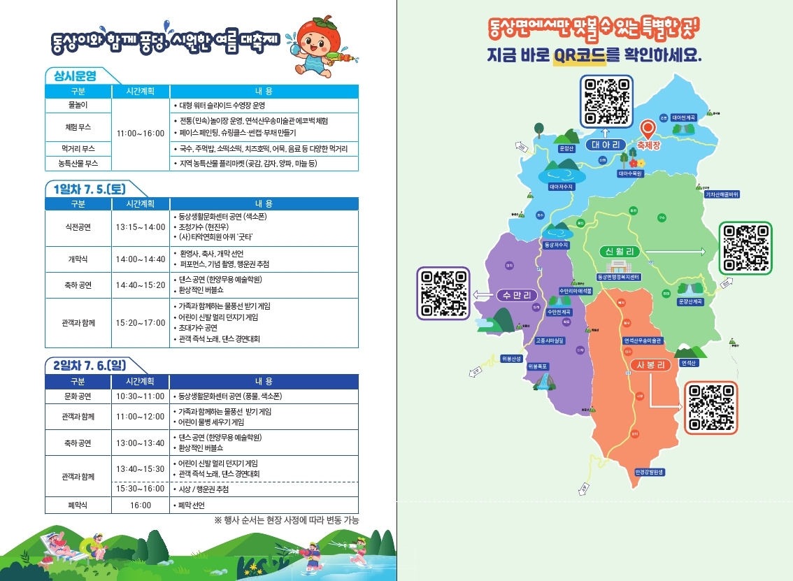 유희태 완주군수는 “이번 축제가 지역 주민에게는 소중한 추억이 되고, 외부 방문객에게는 동상면의 매력을 알릴 수 있는 계기가 되길 바란다”며 “앞으로도 지역 관광자원과 주민의 아이디어를 결합한 차별화된 축제로 발전시켜 나가겠다”고 밝혔다.