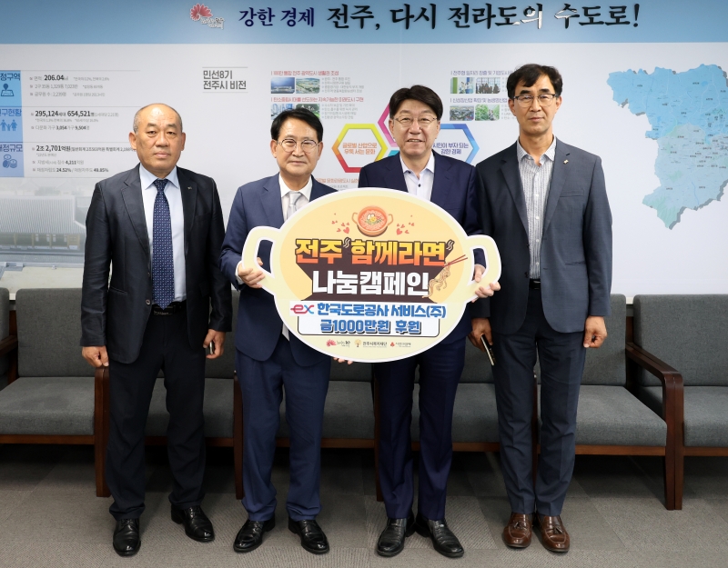 이번 후원은 한국도로공사서비스㈜ 기금과, 전북권역본부 임직원들이 개별적으로 자발적 기부에 참여해 마련한 성금을 모아 마련하였으며, 전주시 사회적 고립위기 가구 발굴을 위한 사업 ‘전주함께라면, 전주함께라떼’ 운영에 사용될 예정이다.