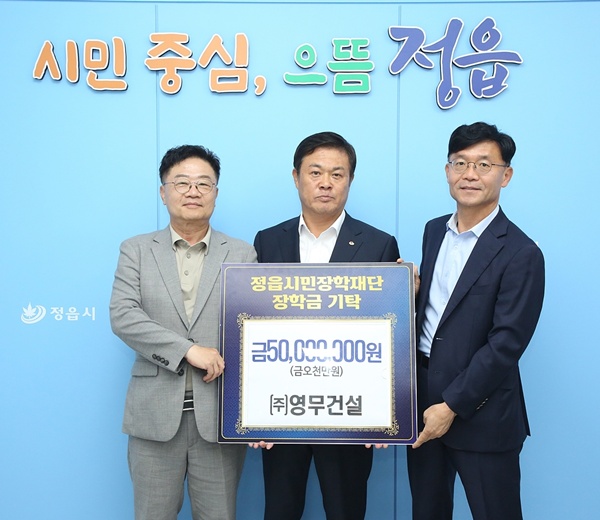 한편, 광주광역시에 본사를 둔 ㈜영무건설은 아파트와 주거용 건물 개발에 주력하는 중견 건설사다. 대표 브랜드 ‘예다음’ 아파트는 전국 50여 개 단지에 조성돼 있다. 정읍시에도 4개 단지를 공급하며 지역 주거 환경 개선에 기여하고 있으며, 이번 장학금 기탁을 비롯해 꾸준한 사회공헌 활동으로 지역사회와의 동반 성장을 실천하고 있다.