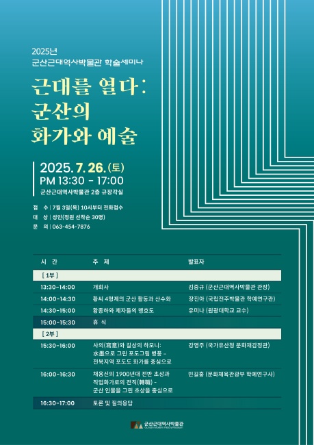 [군산=뉴전북] 군산근대역사박물관이 오는 26일 2층 오후 1시 30분부터 5시까지 규장각실에서 ‘근대를 열다 : 군산의 화가와 예술’ 세미나를 개최한다.