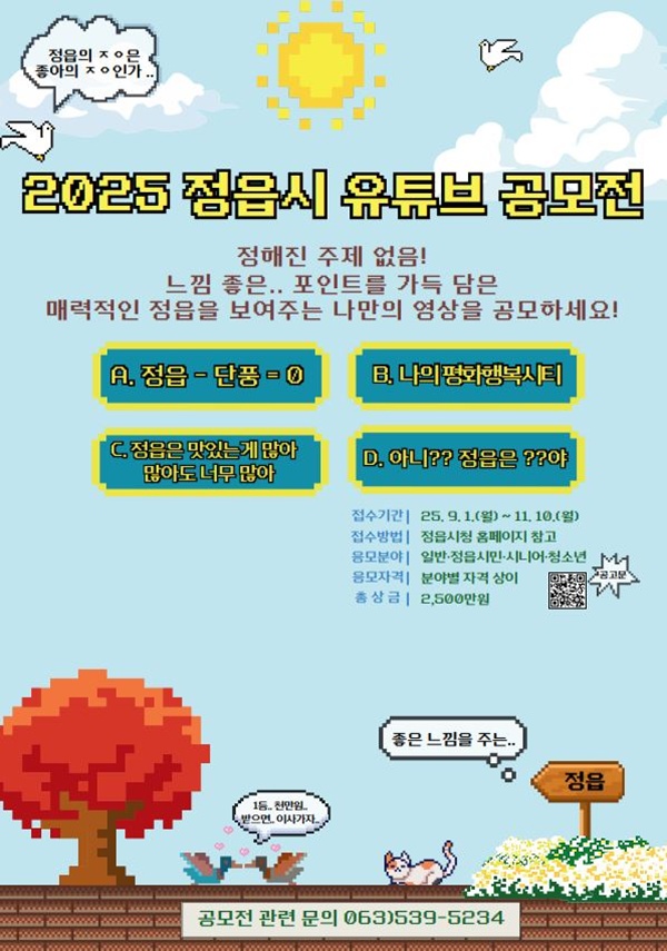작품 접수는 9월 1일부터 11월 10일 오후 6시까지 진행된다. 시상금은 최소 150만원부터 최대 1000만원까지다. 수상작은 정읍시 공식 유튜브 채널을 통해 소개될 예정이다.