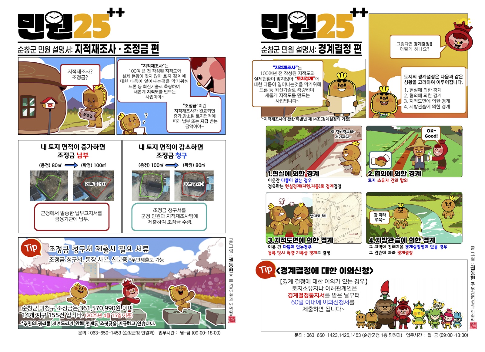 또한 군은 고령자나 다문화 이주여성 등 다양한 주민들이 사업 내용을 쉽게 이해할 수 있도록 ‘순창군 민원 안내 만화’를 제작했으며, 이를 우편과 문자(SMS)를 통해 발송해 지적 재조사 사업을 적극 홍보하고 있다.