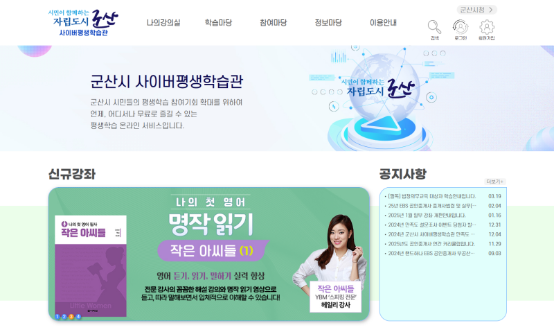 한편 수강 신청 방법은 군산시평생학습정보망에서 회원가입 후 메인화면에 ‘사이버평생학습관 바로가기’ 또는 군산시 사이버평생학습관을 검색해 들어가면 된다.