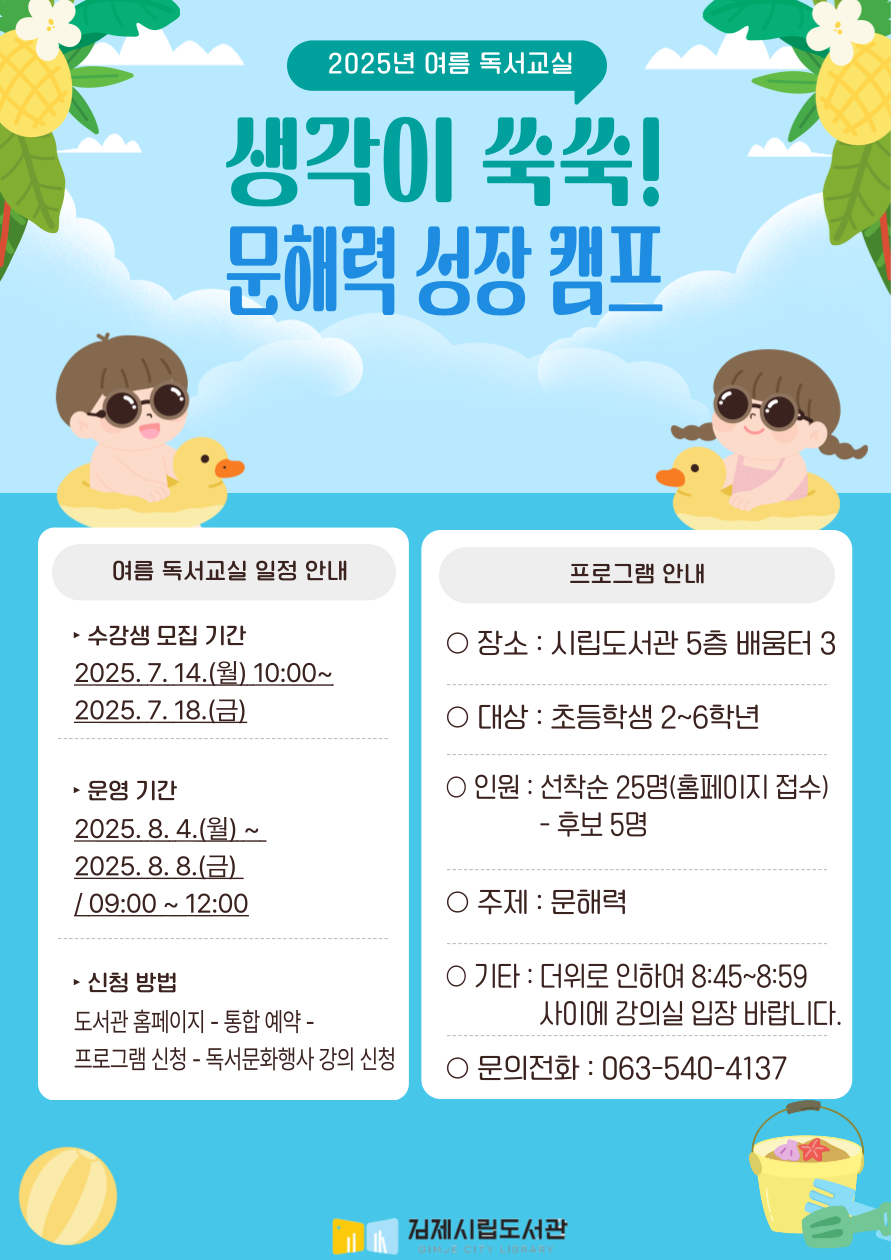 정성주 김제시장은 “이번 프로그램은 초등학생들의 문해력 향상과 사고력 성장을 돕기 위해 기획되었으며, 재미있고 유익한 활동으로 즐거운 독서교실이 되길 바란다.”고 전했다.