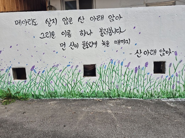 신천지자원봉사단 정읍지부가 정읍 지역 시인 고 박정만 시인의 ‘산아래 앉아’ 시를 벽화에 담았다.