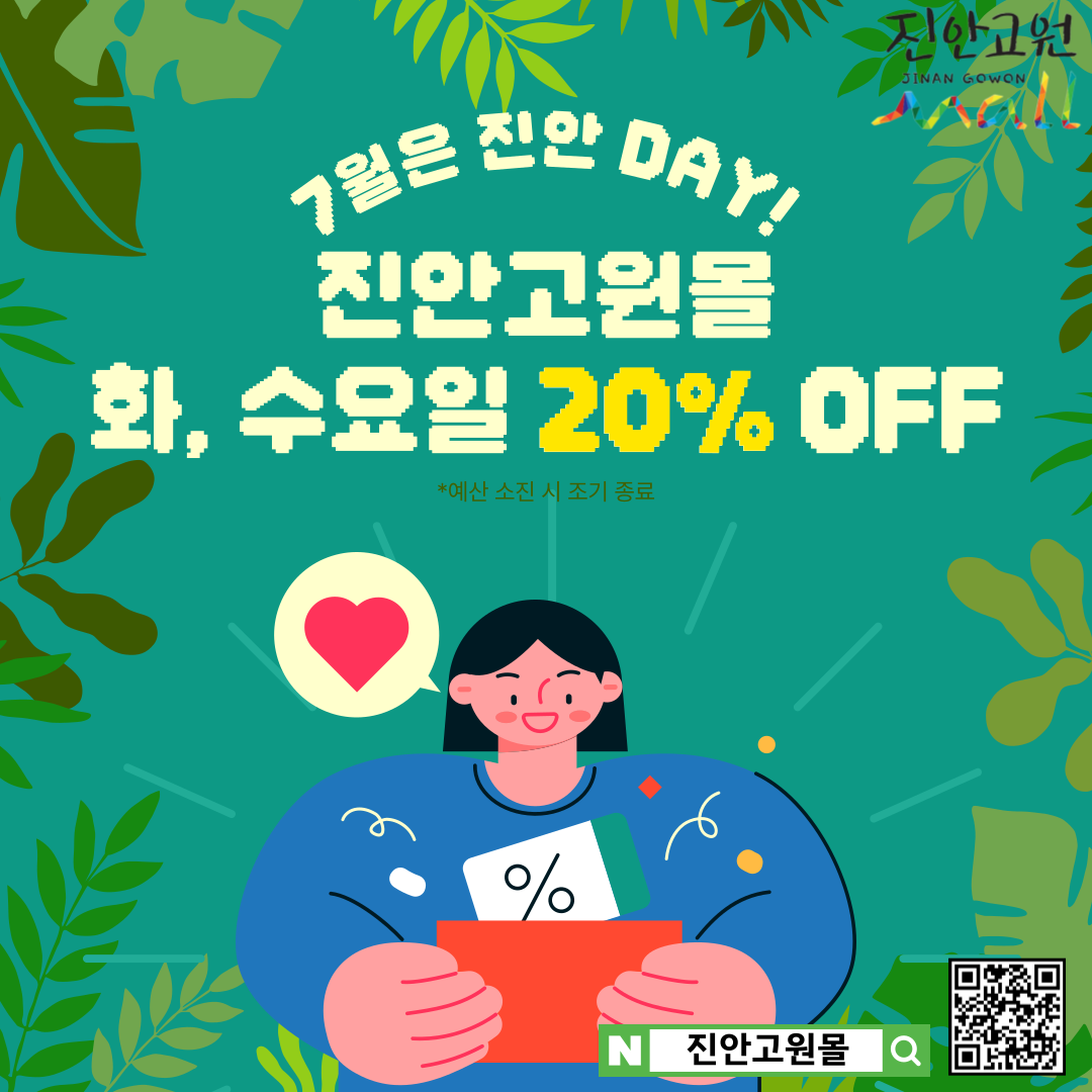 행사 기간 동안 진안고원몰에 입점한 모든 상품을 대상으로 20% 할인이 적용되며, 예산 소진 시 조기 종료될 수 있다.
