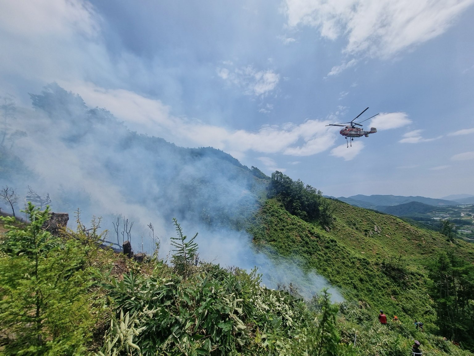 산림당국은 산불예방전문진화대 등 전문 지상진화인력과 공무원 등 총 67명과 산불진화헬기 1대(산림청 소속)를 투입하여, 산불 확산 차단을 위한 방화선을 구축하고 신속하게 진화작업을 전개했다.