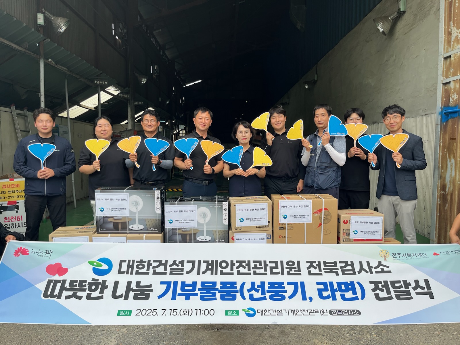 [전주=뉴전북] 대한건설기계안전관리원 전북검사소(소장 송명선)는 15일 전주시복지재단(이사장 윤방섭)에여름철 무더위에 취약한 이웃을 돕기 위한 선풍기와 라면(100만 원 상당)을 기부했다.