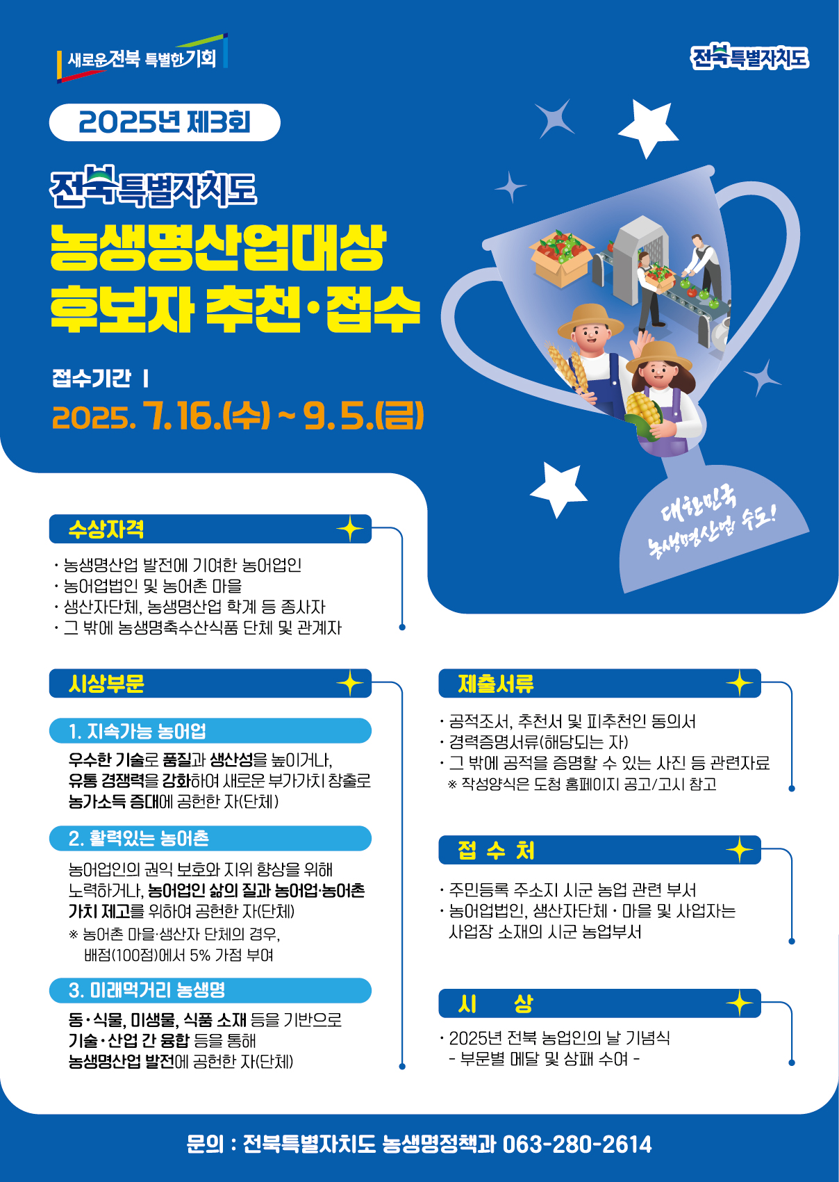 도는 ‘2025년 제3회 전북농생명산업대상’수상 후보자를 7월 16일부터 9월 5일까지 각 시군 농업부서를 통해 접수한다고 밝혔다.
