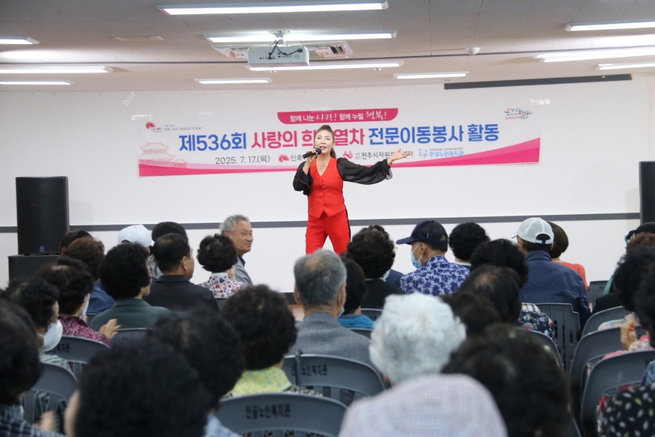 [전주=뉴전북] 사단법인 전주시자원봉사센터(이사장 최이천)와 인후1동주민센터(동장 임미영)는 17일 안골노인복지관(관장 박수진)에서 노인 400여 명을 대상으로 따뜻한 점심 식사와 건강 돌봄 서비스, 문화 공연을 제공하는 ‘사랑의 희망열차 전문이동봉사’ 활동을 전개했다.