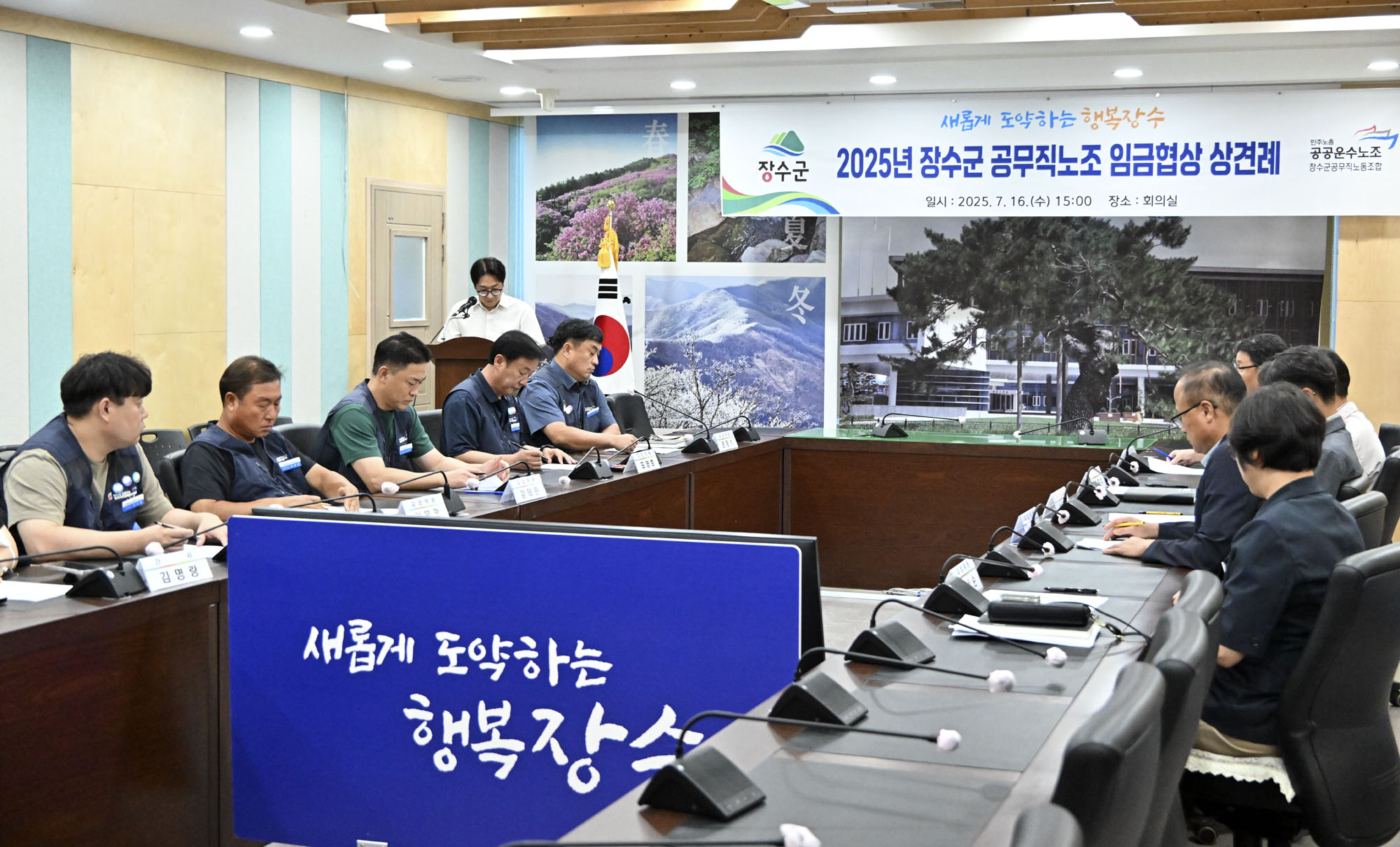 [장수=뉴전북]장수군이 지난 16일 군청 회의실에서 장수군 공무직 노동조합과 2025년도 임금협상을 위한 상견례를 갖고 본격적인 교섭 절차에 돌입했다고 밝혔다.
