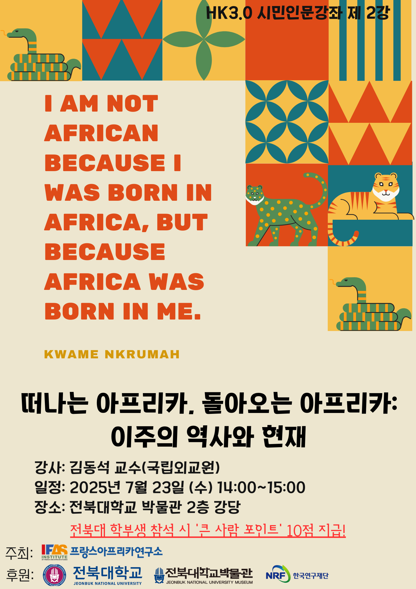프랑스·아프리카연구소의 시민 인문 강좌는시민과 함께, 아프리카를 읽다라는 슬로건 아래, 오는 1210일까지 총 12회에 걸쳐 격주 수요일마다 전북대학교 박물관 2층 강당에서 열린다. 아프리카와 인문학에 관심 있는 누구나 사전 신청 없이 자유롭게 무료로 참여할 수 있다.