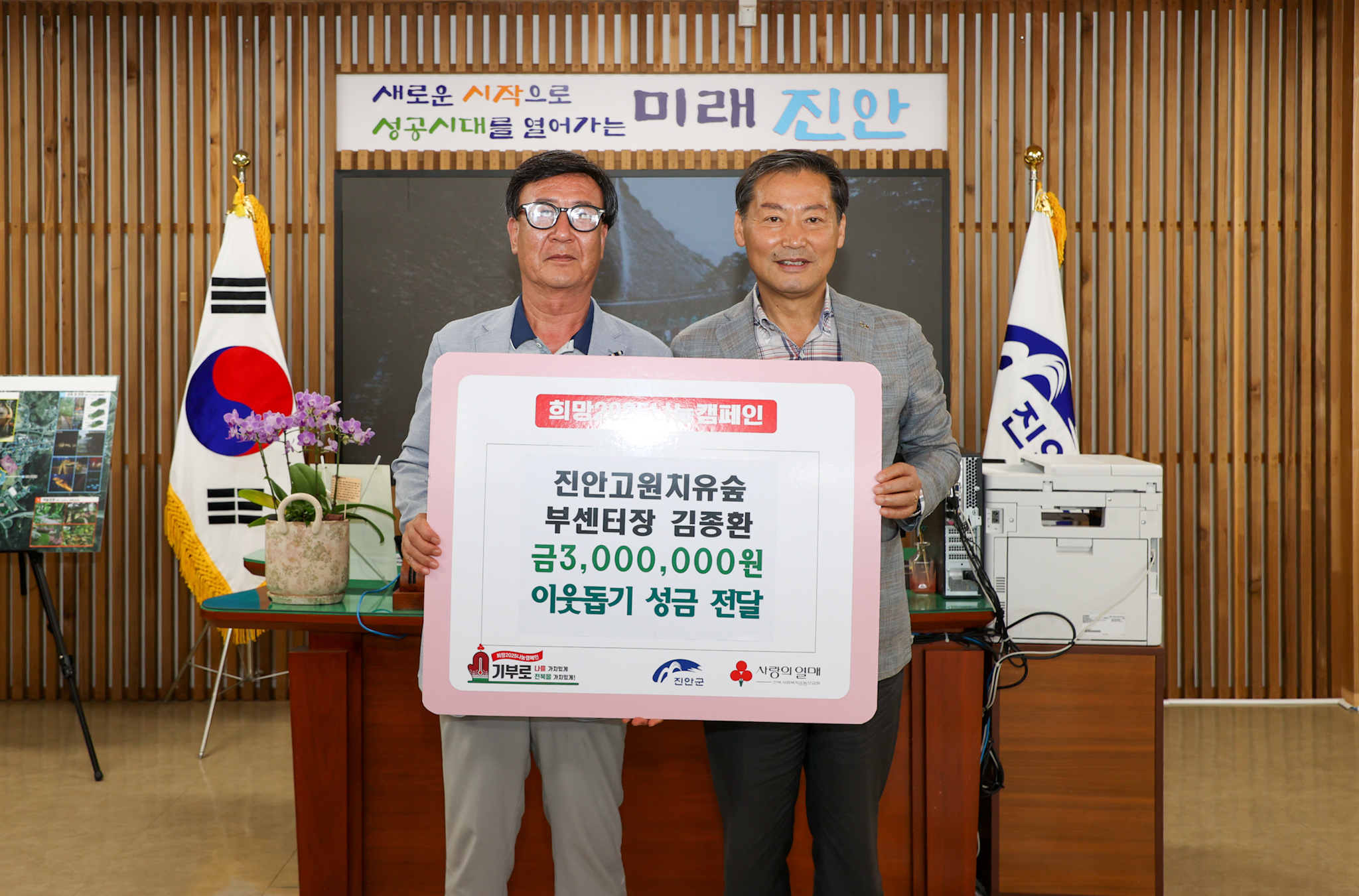 전춘성 진안군수는 “지역사회를 위한 따뜻한 마음에 깊이 감사드리며, 기탁해주신 성금은 어려운 이웃들에게 소중히 전달하겠다”고 전했다.
