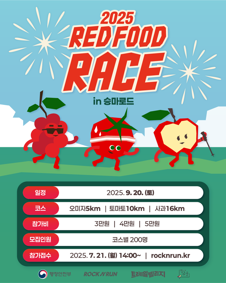 장수의 대표 레드푸드를 테마로 사과 16km, 토마토 10km, 오미자 5km 3개 코스가 운영되며 코스별 선착순 200명까지 접수를 받는다.