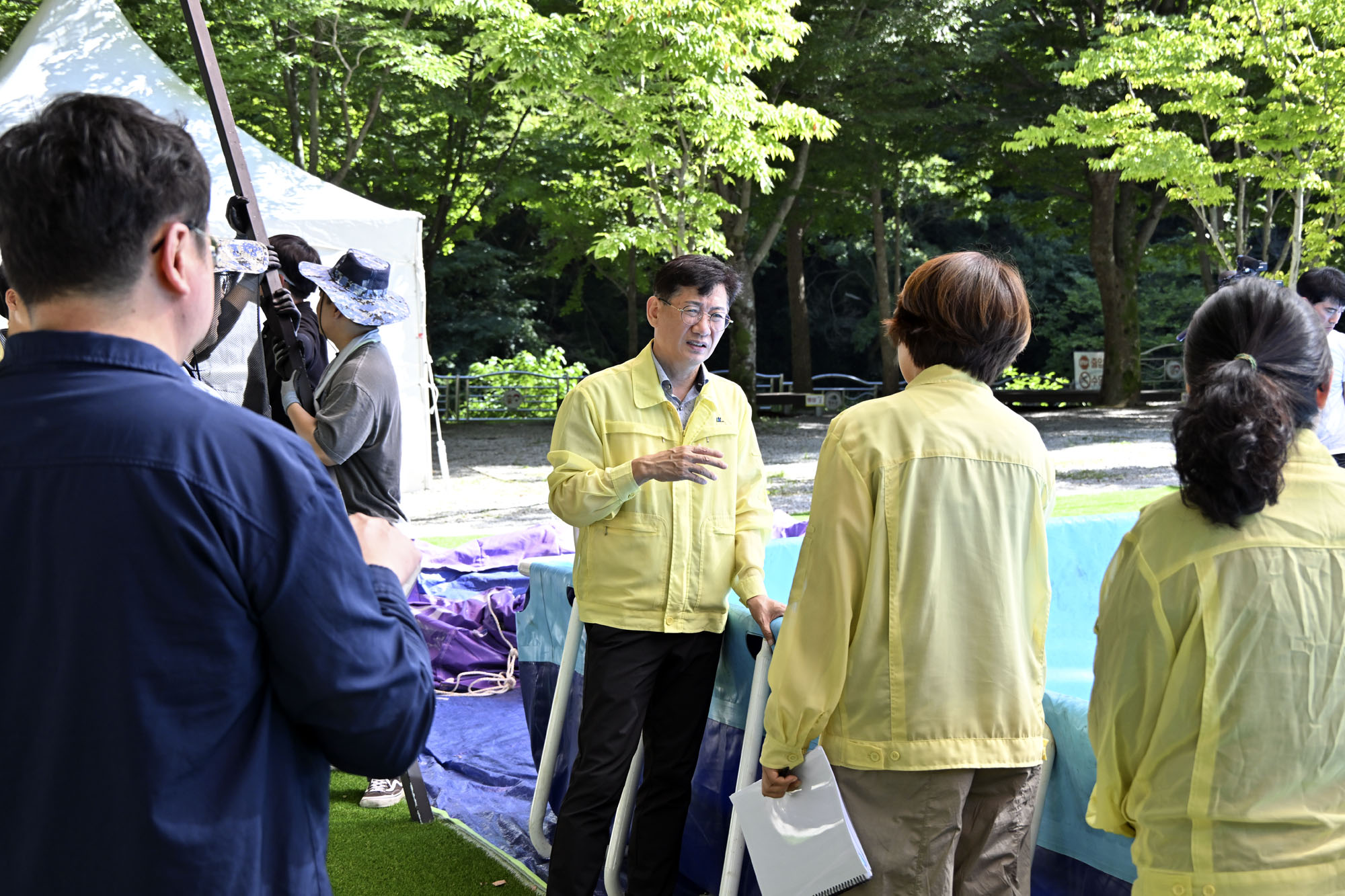 최 군수는 워터파크 풀장을 시작으로 공연장 무대 시설, 체험장, 관광객 쉼터, 먹거리 부스, 교통통제 구간 등 행사장 전반을 차례로 순회하며 현장 분위기와 준비 상태를 세밀히 확인했다.