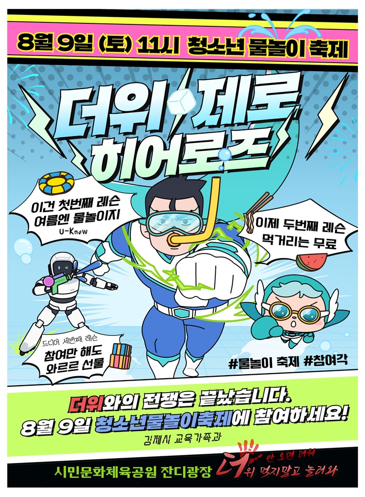 [김제=뉴전?Z]김제시(시장 정성주)는 오는 8월 9일, 시민문화체육공원 잔디광장에서 ‘제4회 김제시 청소년의 날 기념 물놀이 축제’를 개최해, 무더운 여름을 날려줄 청소년 맞춤형 즐길 거리와 볼거리로 가득한 하루를 선사한다고 밝혔다.