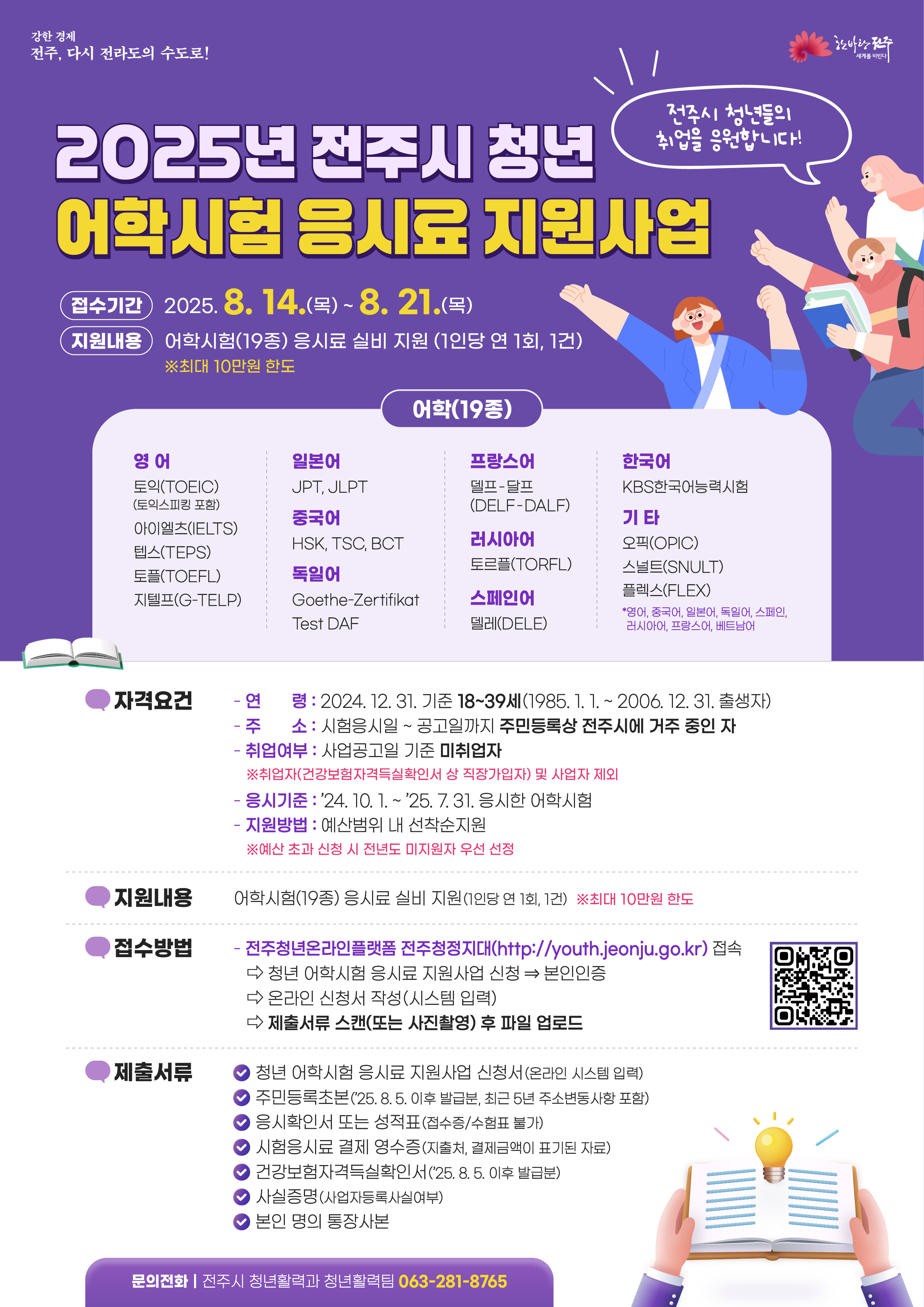[교육=뉴전북] 전주시는 미취업 청년의 경쟁력 강화를 돕고 경제적 부담을 덜기 위해 ‘2025 청년어학시험 응시료 지원사업을 오는 814일부터 21일까지 시행한다고 1일 밝혔다.