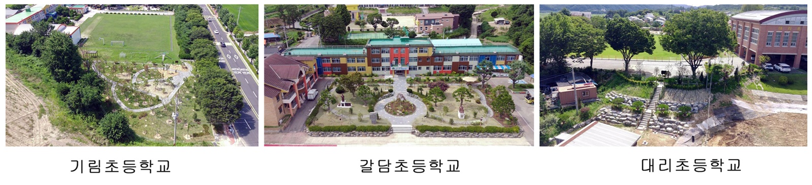 갈담초등학교와 대리초등학교에는 교목과 관목, 초화류를 새로 심고, 임실기림초등학교는 기존에 식재된 수목을 활용하여 학생들이 식물을 관찰하고 자연을 직접 체험할 수 있는 쾌적하고 아름다운 학습 공간을 조성했다.