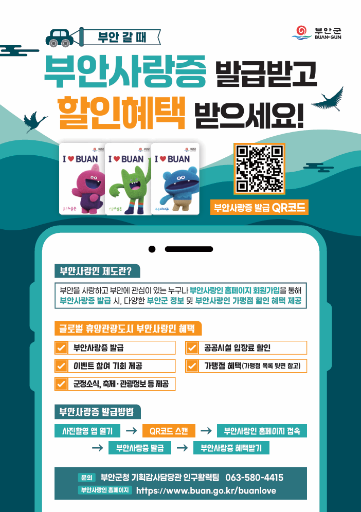 부안사랑인 제도는 부안군에 관심 있는 누구나 부안사랑인 홈페이지 회원가입을 통해 부안사랑증 발급 시 다양한 부안군 정보 및 부안사랑인 가맹점 할인 혜택을 제공하는 제도이다.