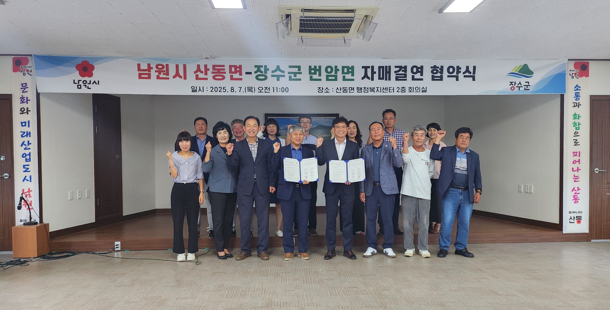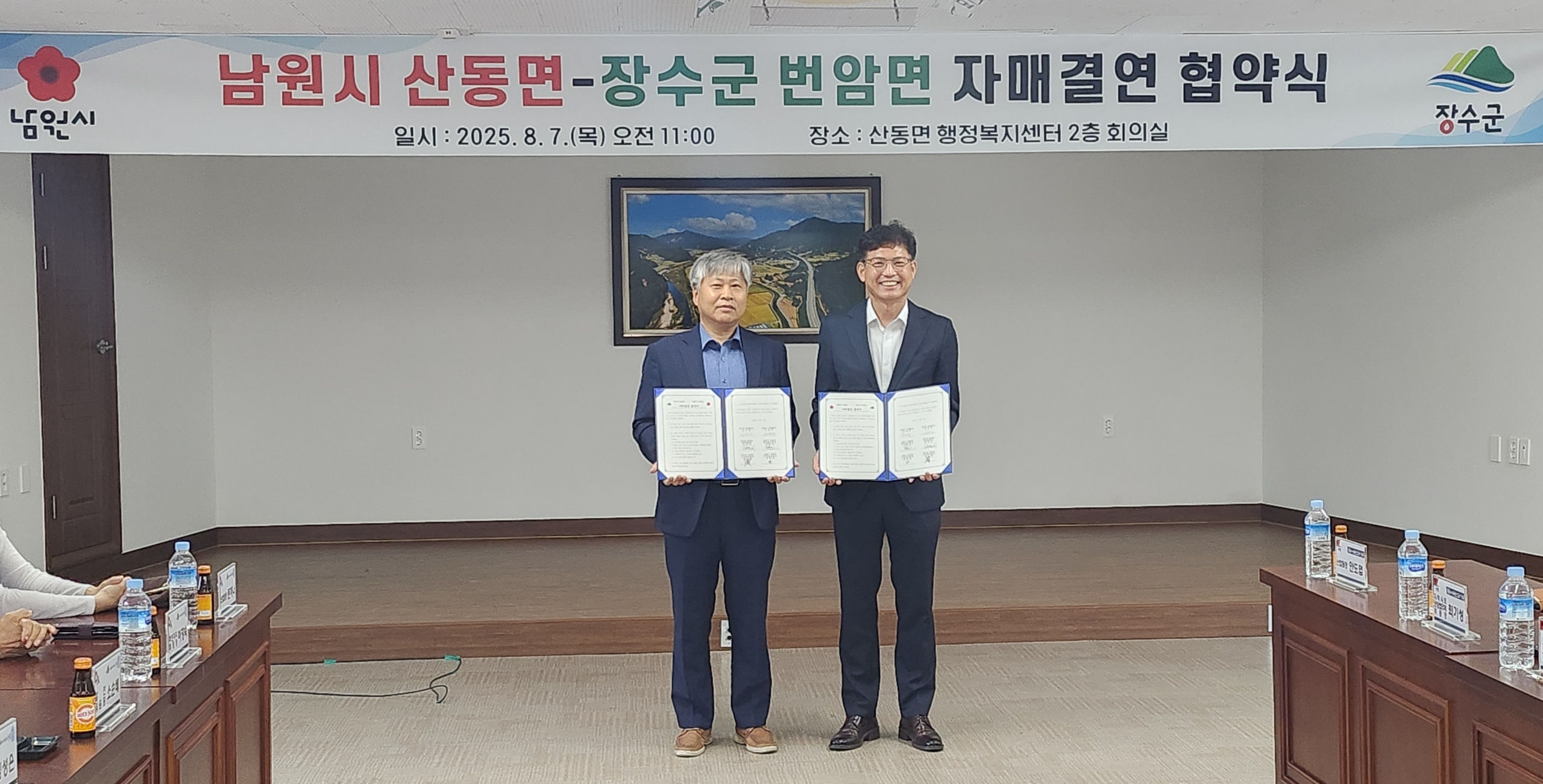 [장수=뉴전북] 장수군 번암면과 남원시 산동면은 7일 산동면사무소 회의실에서 자매결연 협약을 체결하고, 행정·문화·경제 등 다양한 분야에서 상호 협력을 강화해 나가기로 했다.